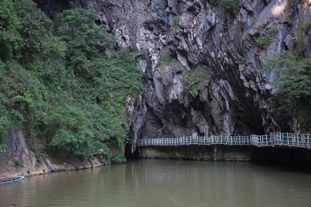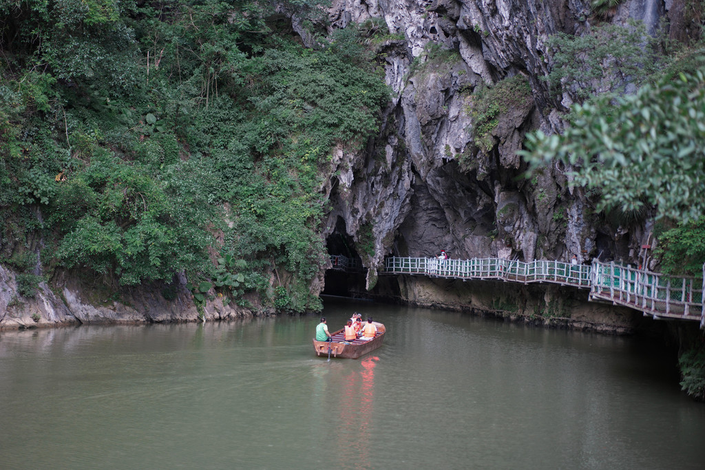下了玻璃桥,我们就来到了闻名已久的天坑。这是华南地区最大的天坑,深达231米,面积近百亩的喀斯特天坑,进入天坑游玩有两种途径,一种是坐船游玩,一种是从悬空栈道走进去游玩,两种方式各有各的乐趣,我们选择的是坐船游玩。