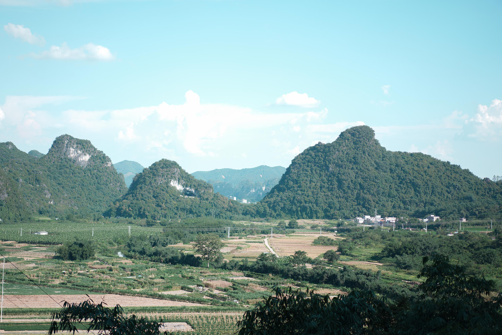 站在玻璃桥上,远处的蓝天白云、青山田野便呈现在眼前,天空之中白云朵朵,峰林延绵错落,喀斯特地貌独特的山势婀娜延绵,山下是碧绿棕黄交错的田野和错落有致地村落,村落屋顶上袅袅炊烟缓缓升起,这宛如一副宁静优美的画卷。