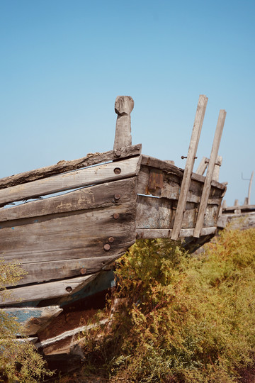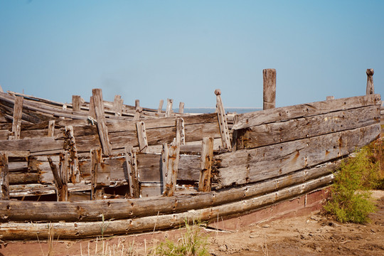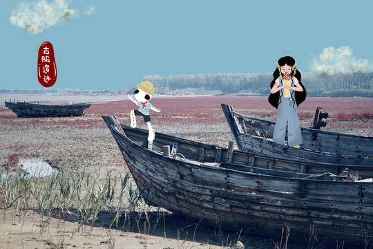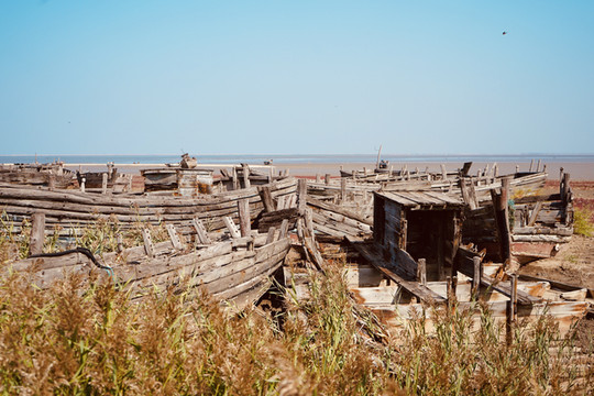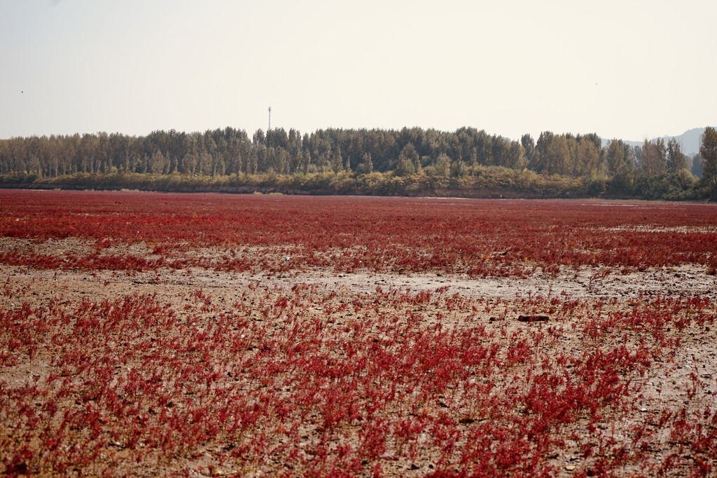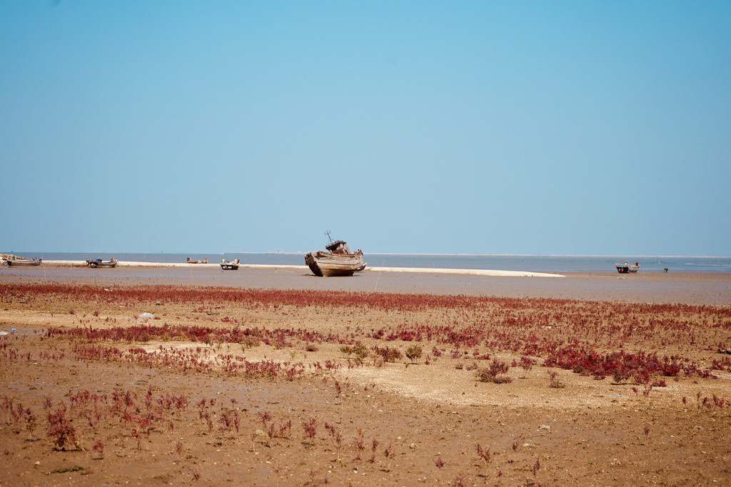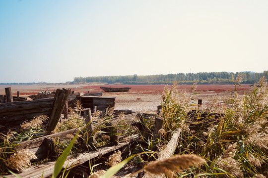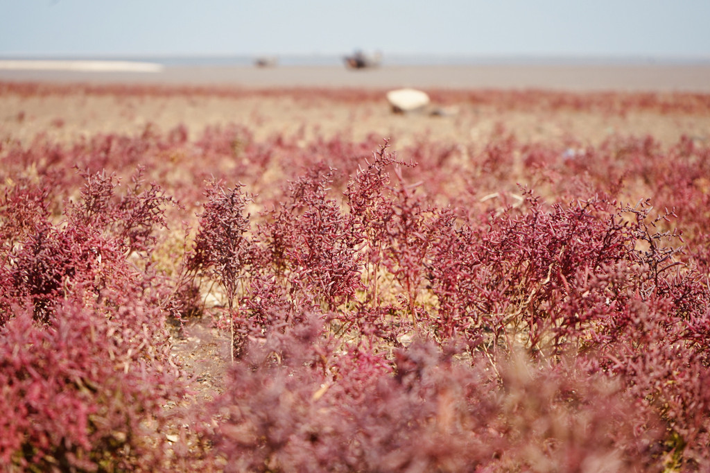 红海滩而今已紫红一片。古船遗迹散落在连片成毯的紫红碱蓬草。