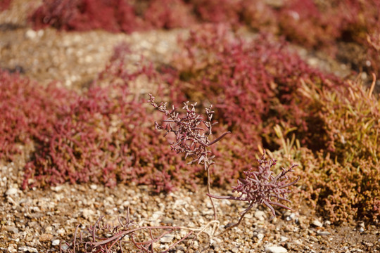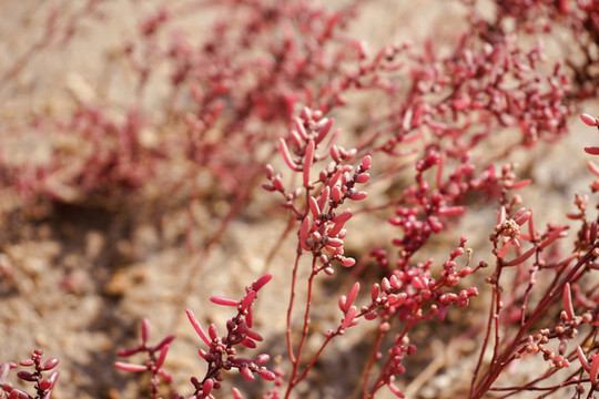 一棵棵像多肉看似纤弱激萌,却生命力无比顽强的碱蓬草,遍地生发繁衍,随季节变化色泽由粉红到火红再到紫红。