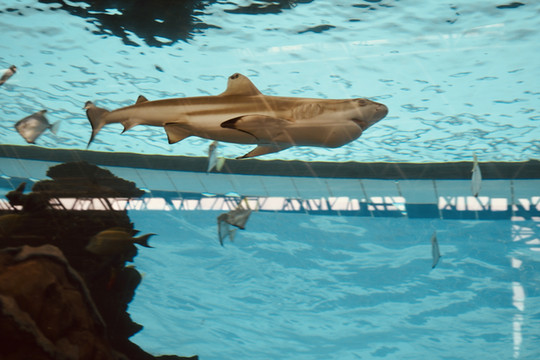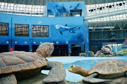 水族馆里有小鲨鱼和海龟游弋。