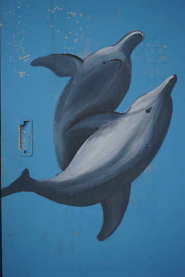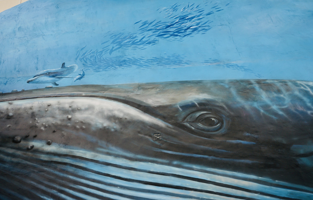 墙绘的蓝鲸和海豚,幽蓝色布光瞬时将人拉入海底世界。
