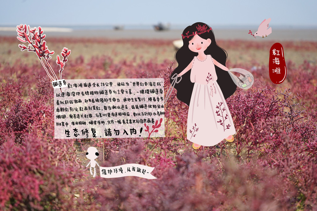 红海滩以退海湿地先锋植物碱蓬草为主要元素。