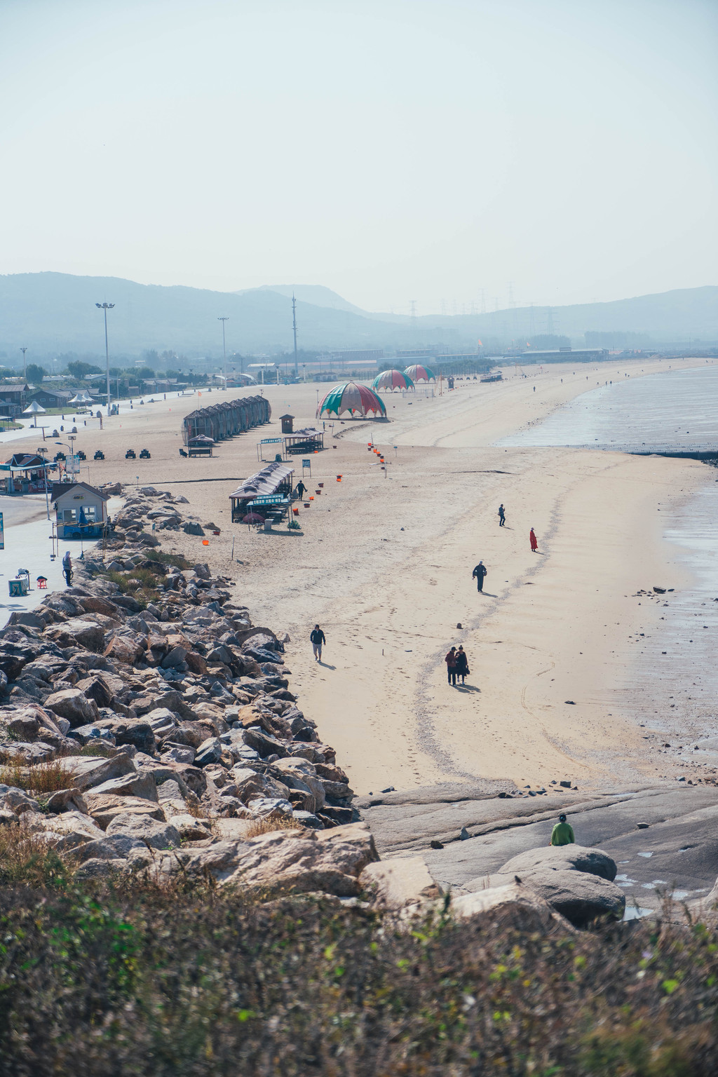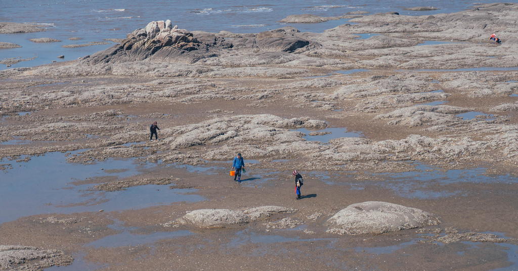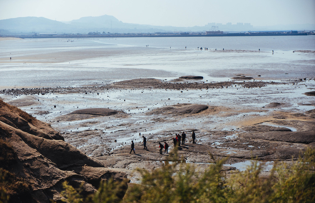 趁着退潮,有游人提着塑料筐来挖螃蟹,也有三两相伴来遛弯儿。