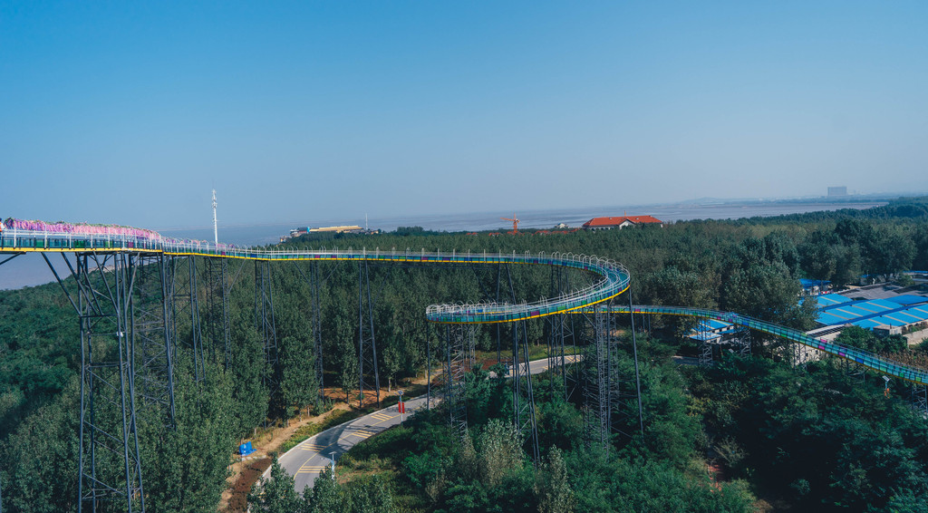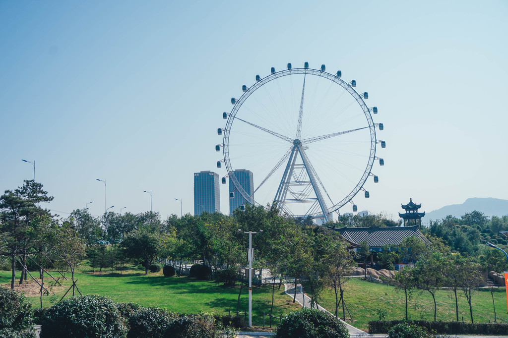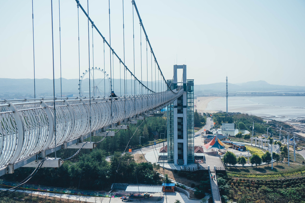 浴场的不远处是高耸入云的摩天轮,而另一侧矗立着“观海第一桥”。