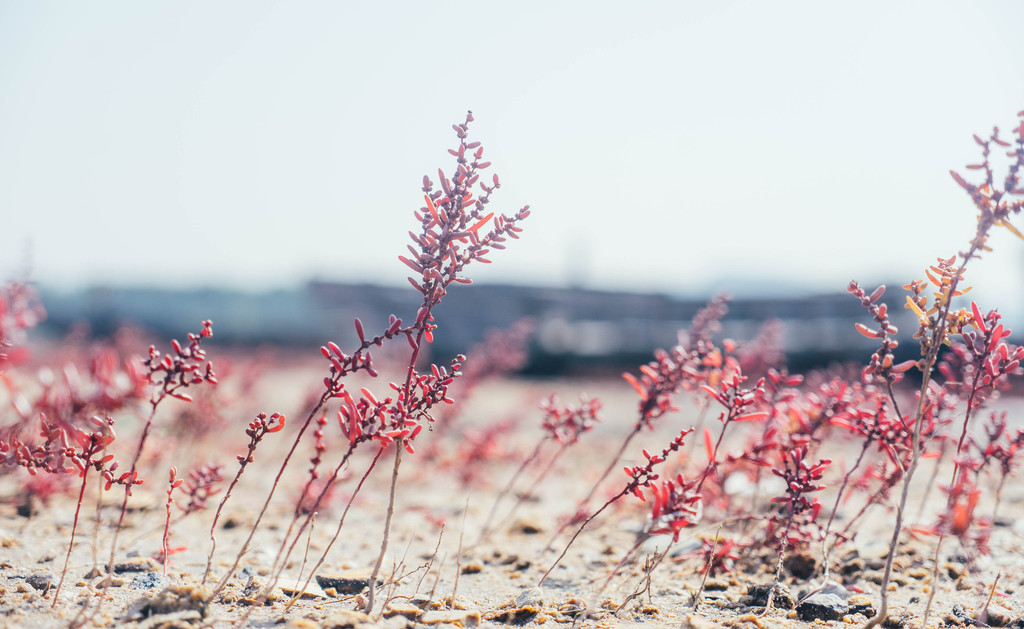 在这片绵延近3公里的滩涂上,神奇的碱蓬草茁壮成长,每年的9.10月份由红变紫,有着昂扬的生命力。日复一日,年复一年,盐碱地里开出了一片红色的生机。