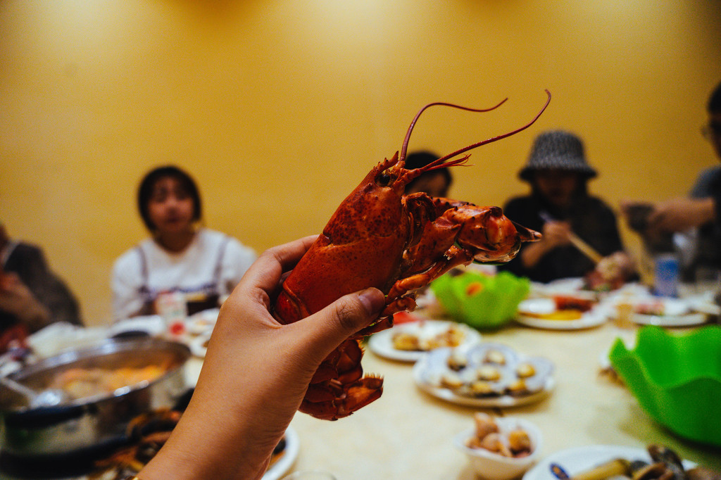 锅子点起来驱散了东北夜晚的清冷,一旁的龙虾和鲍鱼也不甘示弱的挑动着食欲。