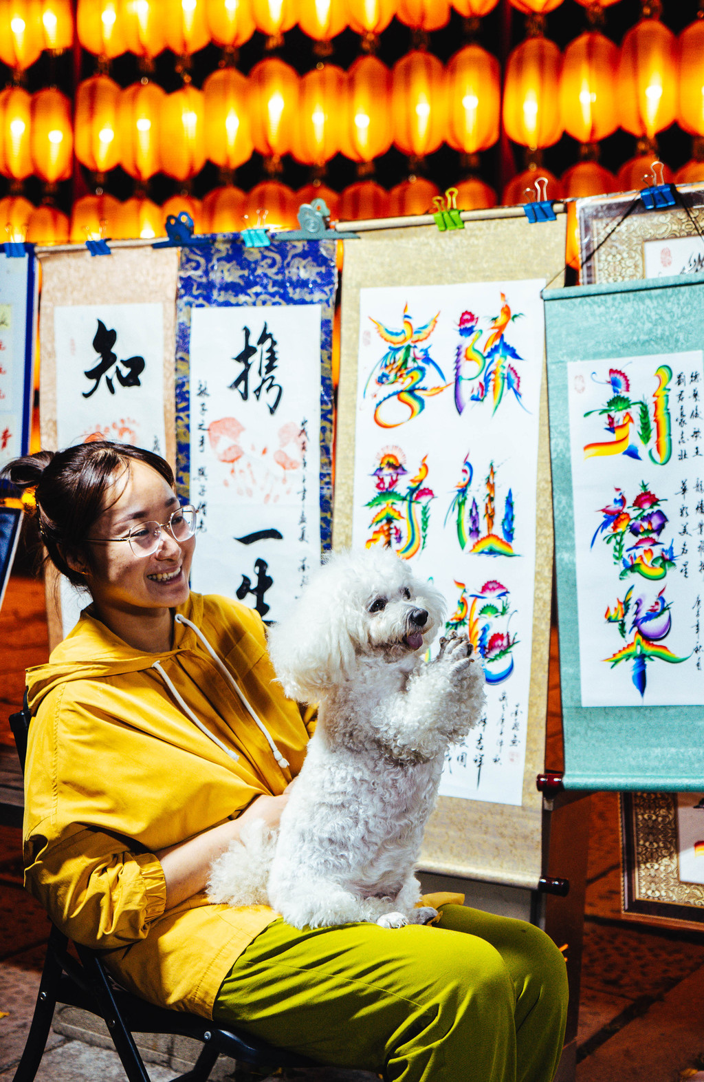 街边的小贩最是活跃,穿着应景的服饰,热情的招揽着来往的人群。有见排着长队的老字号火烧摊儿,见识了大连焖子的美味,还顺便在街边的字画店撸了几把狗子。