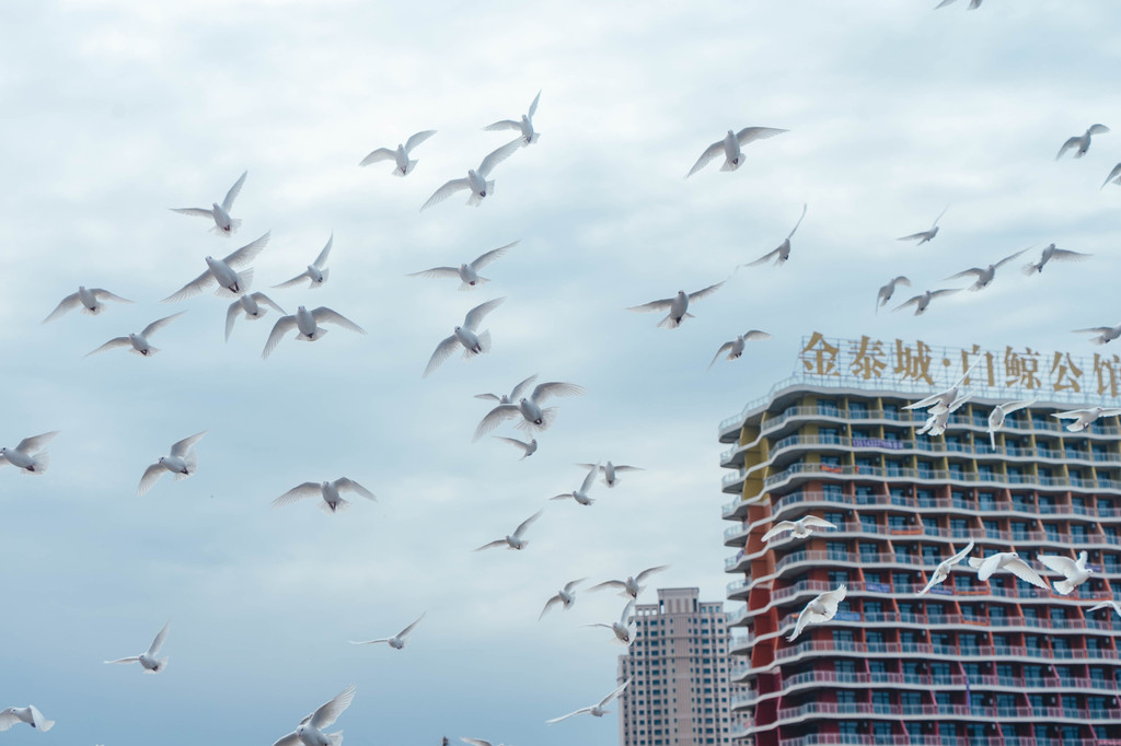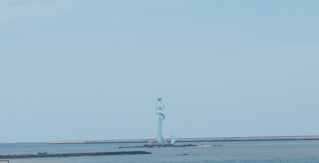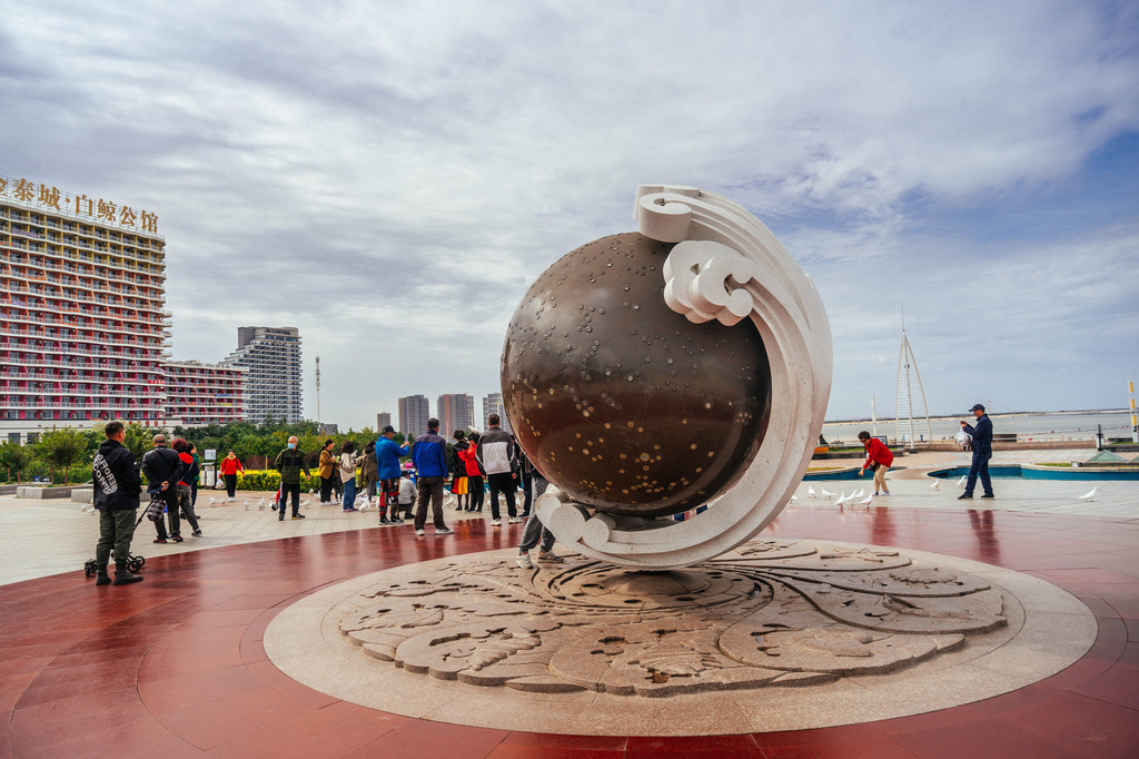 初见营口的海,是在山海广场。极目远眺,距岸边1500多米的海面上,高达60米的鲅鱼公主雕塑翩跹起舞,与广场遥相对望。天海一线间,白鸽成群起飞,为碧蓝的天空增添了整片白色的风景线。