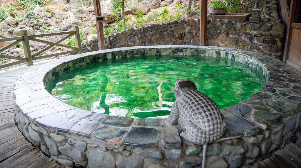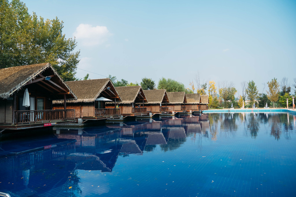 满眼绿意的外观,卡通装饰的小屋,温泉池旁的葫芦……像是闯进了儿童乐园。