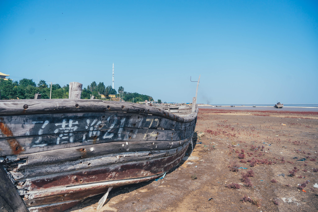 在这大片的红色之上,覆盖着30多艘造型各异、时代不同的老旧帆木船。古旧的木头与红色的滩涂交相呼应,自然的壮阔之美与历史的厚重质感完美结合,入眼便心生感叹,只觉发自内心的感动与震撼。