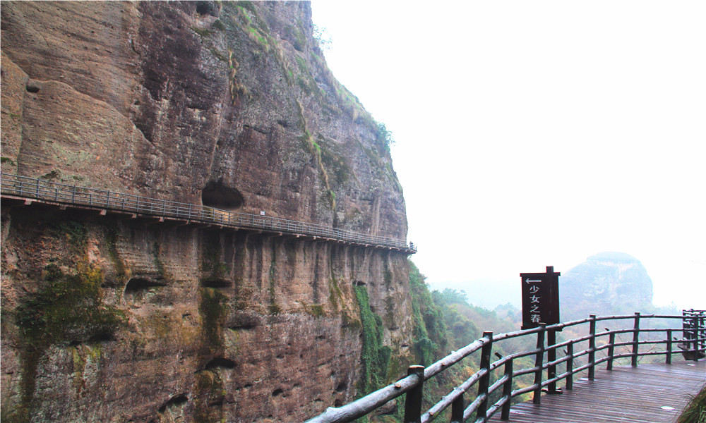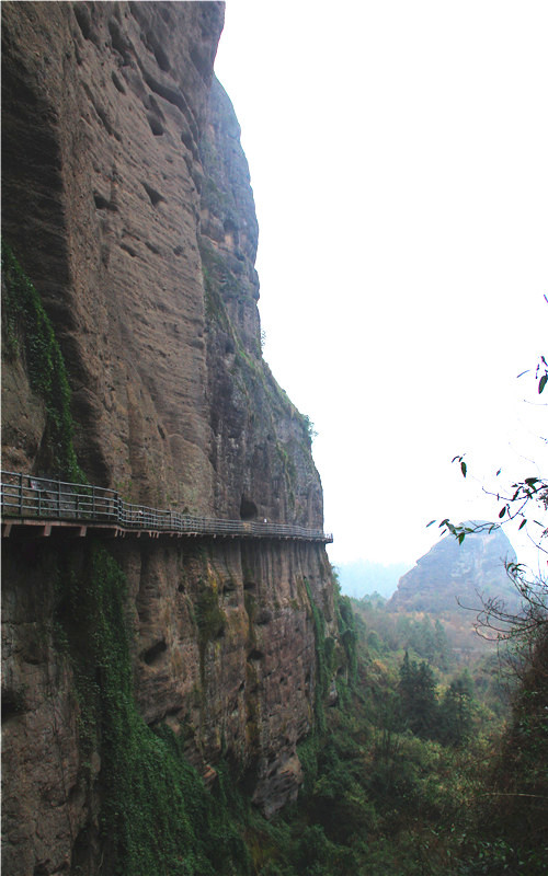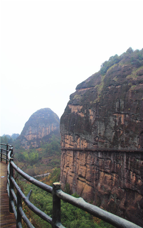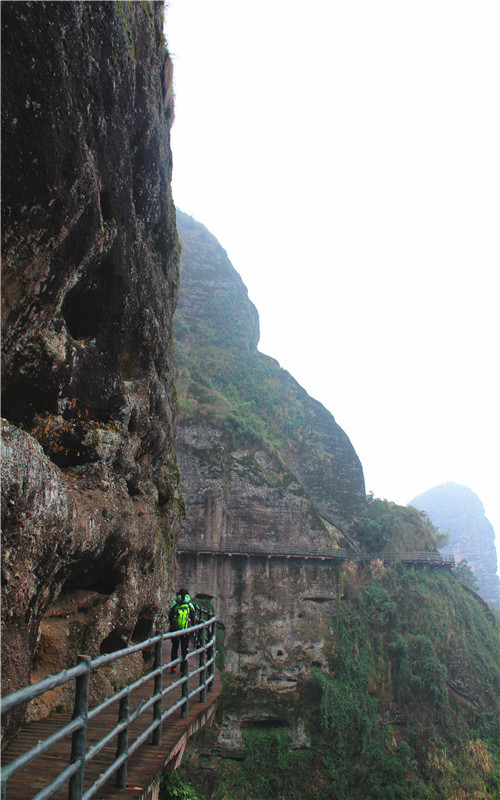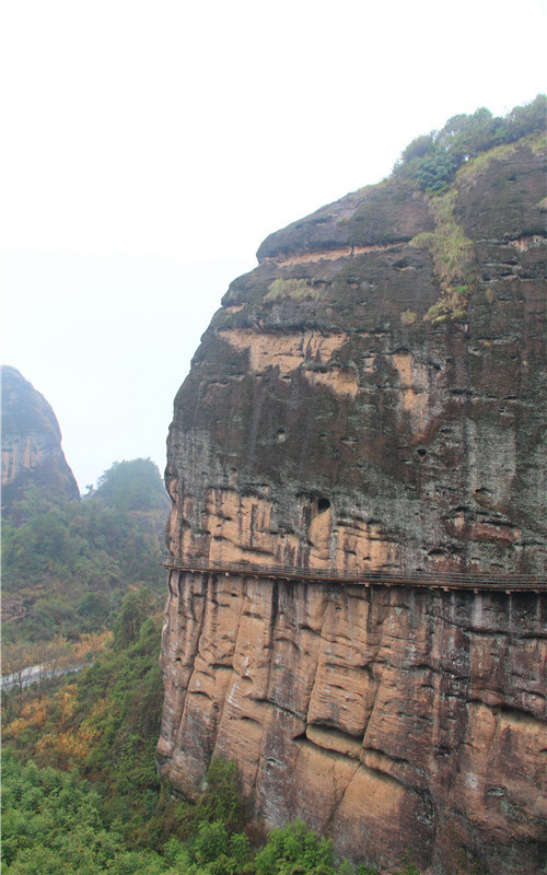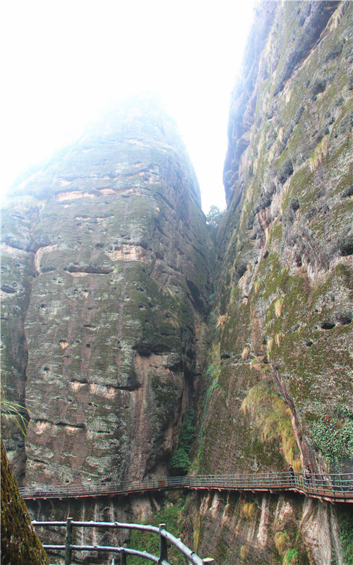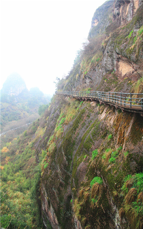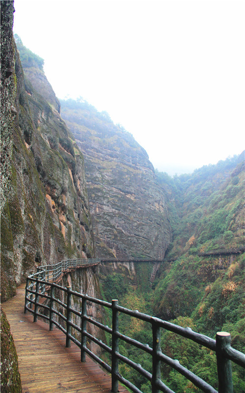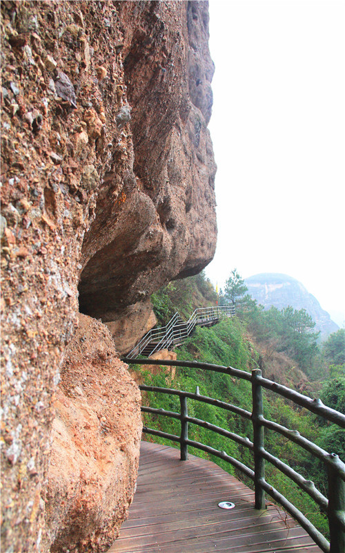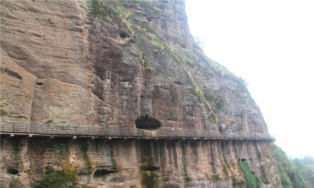 龙虎山的高空栈道实际上并不怎么高,像一条游龙蜿蜒缠绕在悬崖峭壁之上,沿途也比较平缓错落起伏不大。