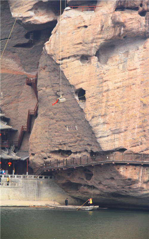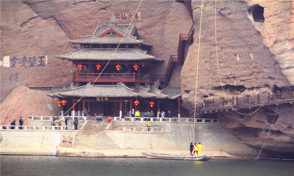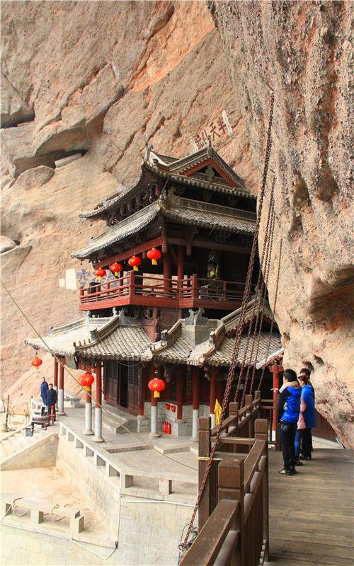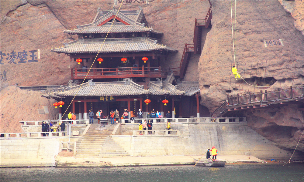 栈道通岩中寺,寺庙循穴而建,上下七层,又称七层庙。悬崖为盖,下有石坪,开阔敞亮,能容数百人,庙毁后常有游客对弈于此,或携酒作乐其中。