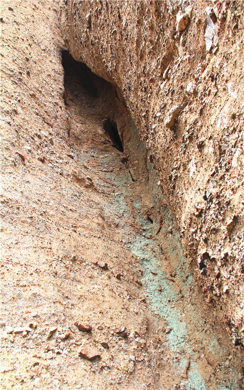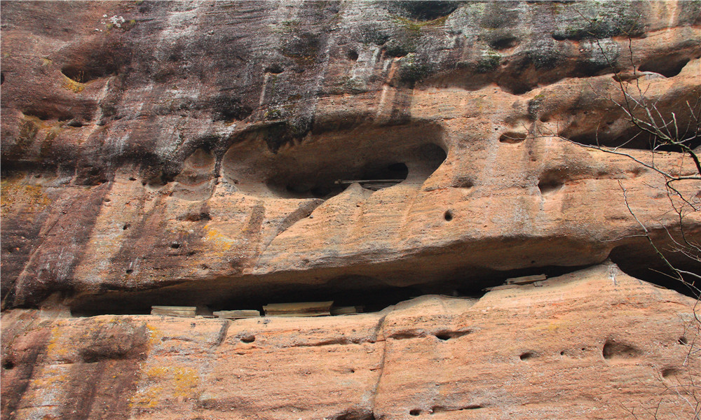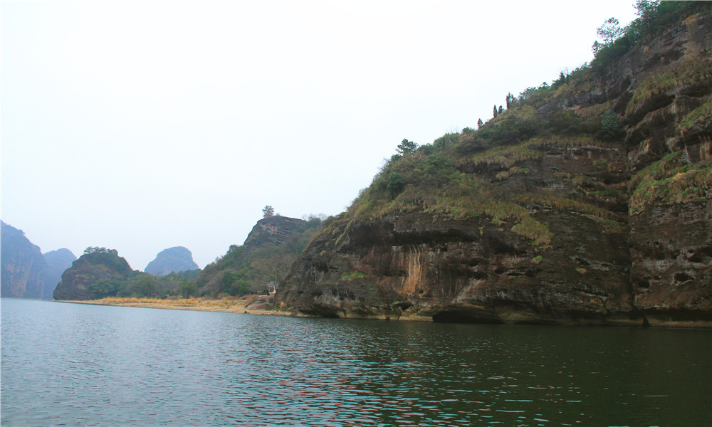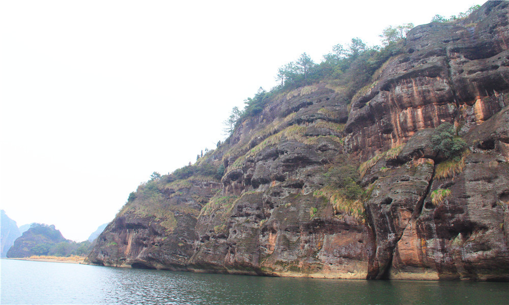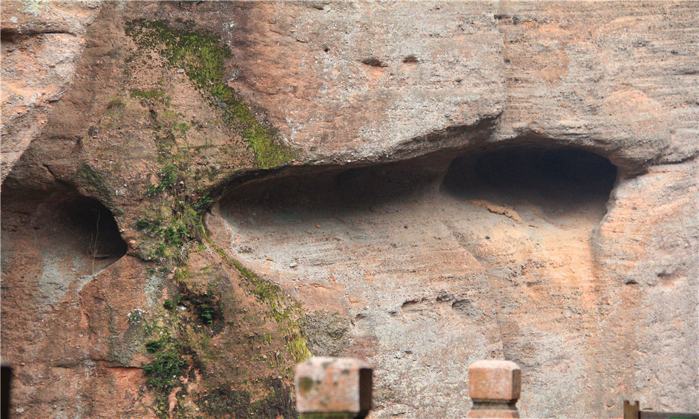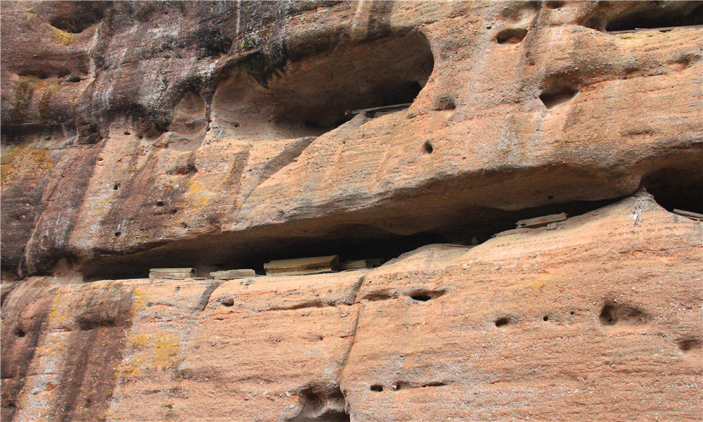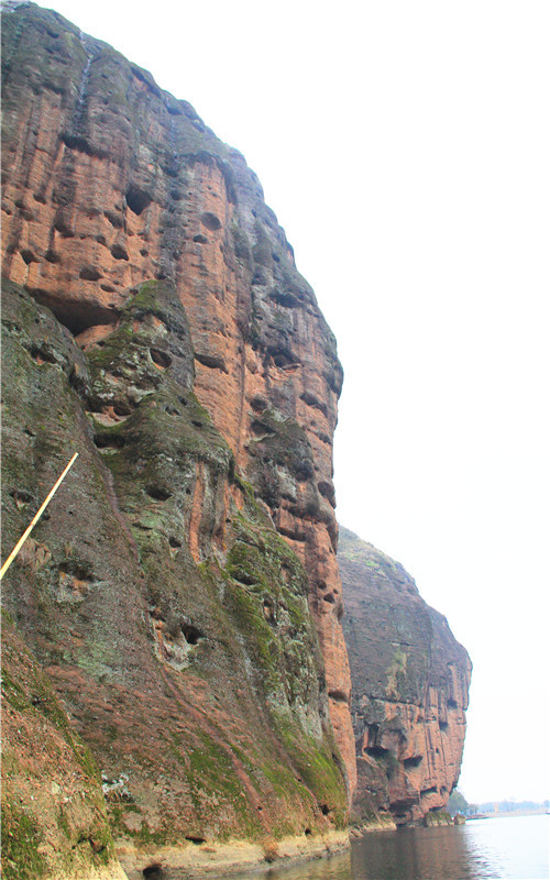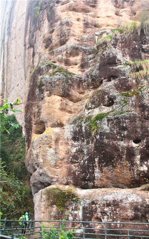 竹筏漂流一小时后,在仙水岩登岸。在登岸处的峭崖绝壁之上看到有两排人工开凿的方形洞眼,那就是古栈道遗址。