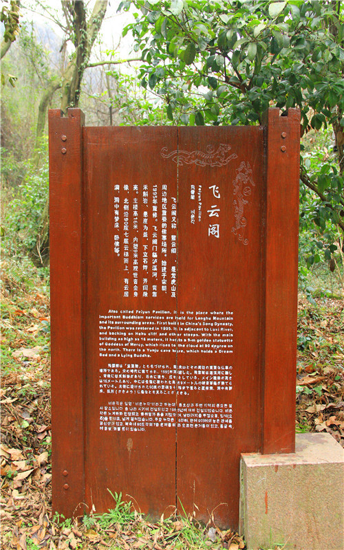 飞云阁面临泸溪碧水,背靠禾觚岩,悬崖为顶,主楼高16米。殿内塑有9米高的观音像。北侧沿坡度为70度的七层云梯而上,可达云居洞,云居洞内有梦床、卧佛等。