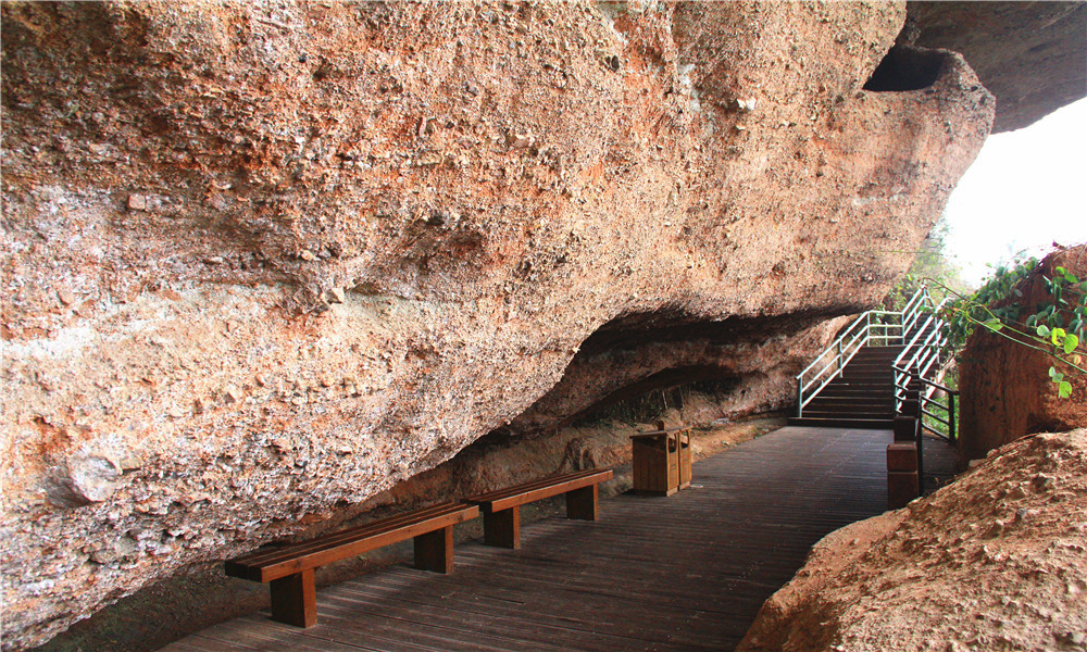 象鼻山是长期受雨水冲刷溶蚀风化而脱落,造成崩塌残余型的石梁穿洞类景观。