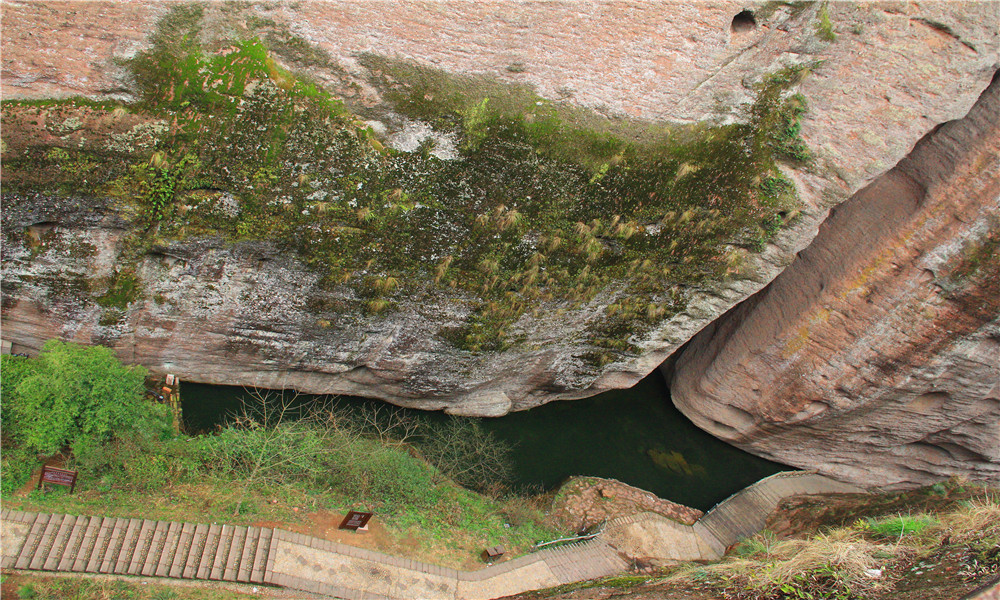 仙女岩潭外有参天古榕,荫蔽水潭。岩口外部绝壁数丈。