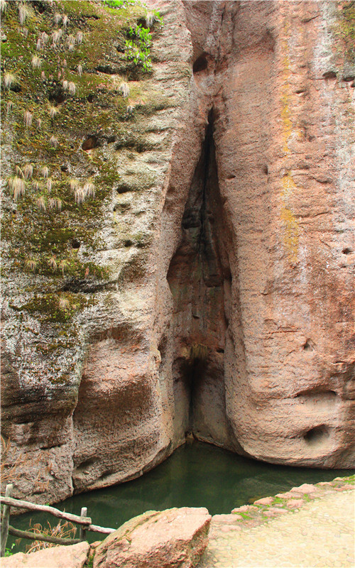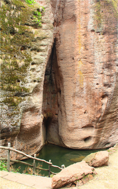 仙女岩岩道纵横曲折幽深,全程1000多米,岩前有潭水一泓,碧绿清澈,与岩内地下河相通。