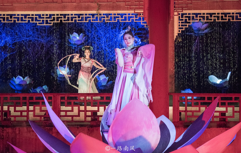 看!那边出现几个仙女,正中的“仙女”正在一朵巨大的莲花上挥动水袖曼舞,左侧长廊上两个古人正在抚琴吹笛。