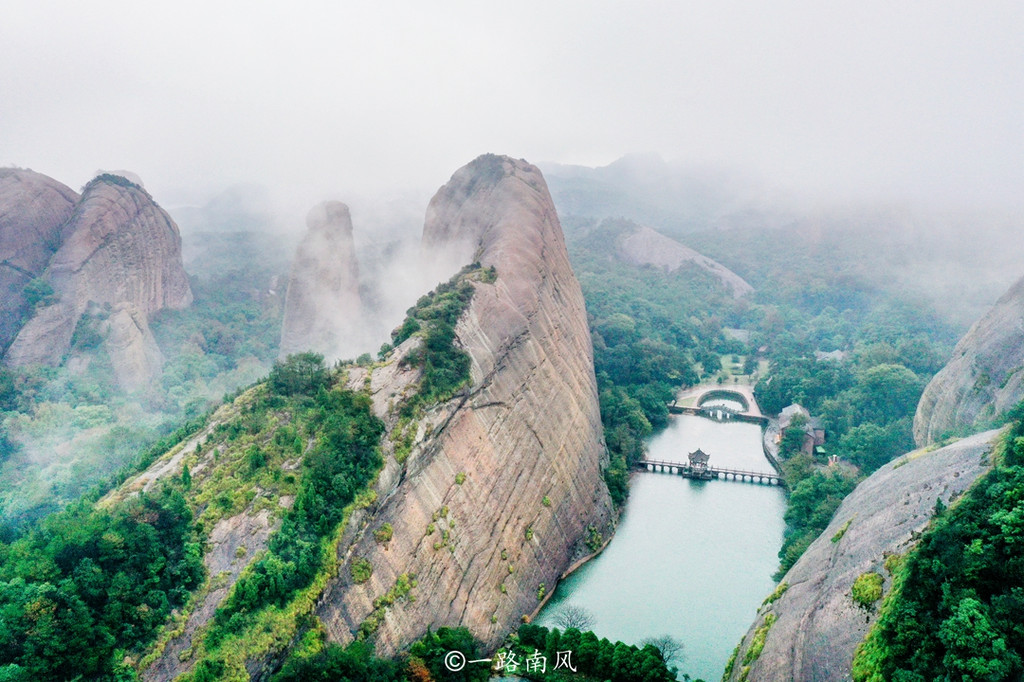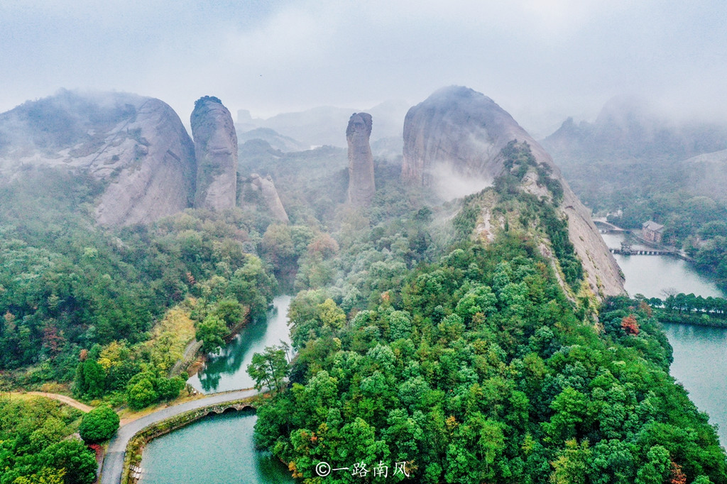 江南的天总是千变万化,丰富的水资源和山形地貌导致阴雨天气较多,不过龟峰在不同天气条件下都有不同的美态。晴天的龟峰就像一幅色彩明艳的水彩画,阴天、雨天和云雾天就像淡墨轻描的水墨画,呈现出诗意的浪漫和梦幻感。