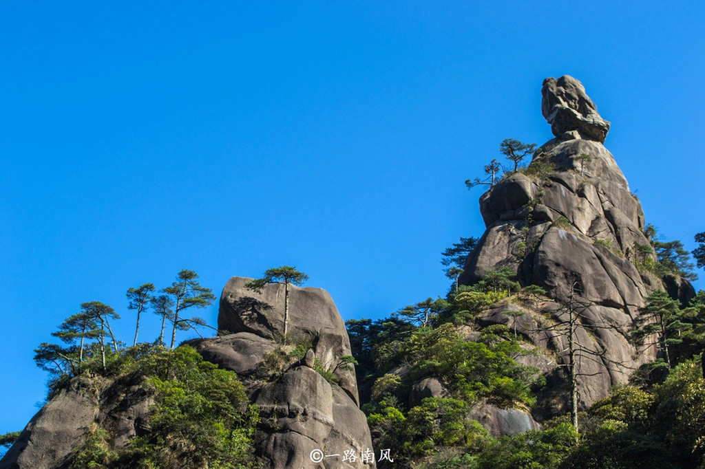 三清山的晴天,天空蓝得没有一丝杂质,沿着登山步道和盘山栈道行走,迎面清风徐来,突然出现在眼前的松树或直立着身子迎接太阳光的照射,或从悬崖峭壁斜倚着身子接受阳光的洗礼。生命在岩缝中发扬不屈不挠的精神,各种奇峰彰显大自然的鬼斧神工。