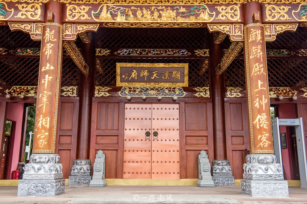 天师府的大门以朱红色调为主,梁柱等处刻有金色木雕,两侧的立柱有一副对联,上面写着“麒麟殿上神仙客,龙虎山中宰相家”字样。