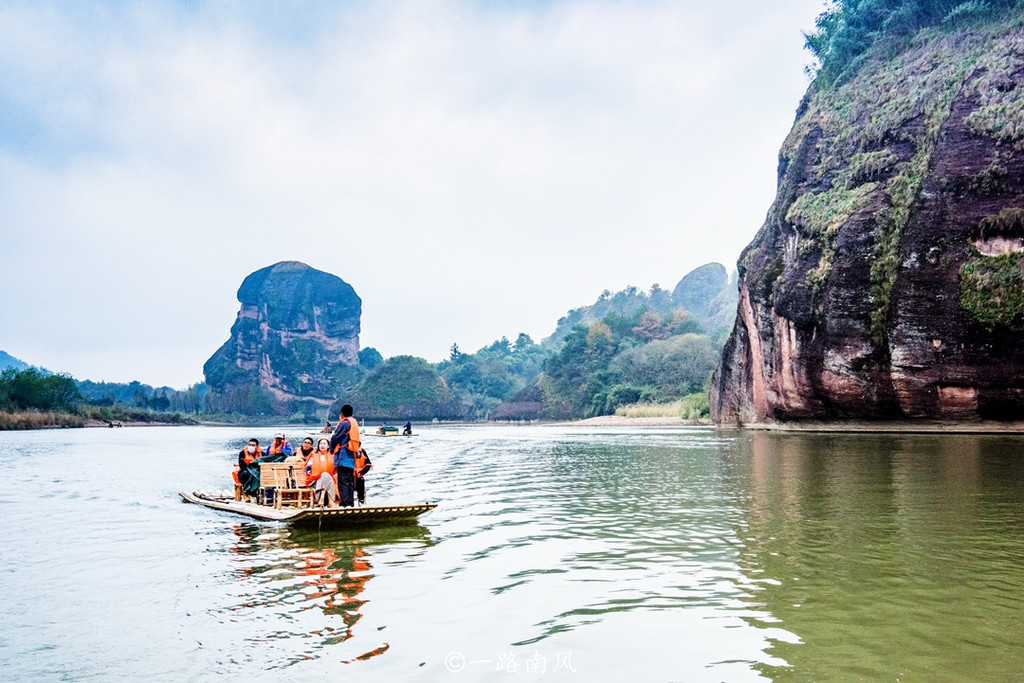 从码头乘坐竹筏沿泸溪河漂流,水景和丹霞奇峰互相映衬,各种形象的奇观像移动盆景不断出现在眼前,又消失在身后,即使在阴天视觉下也有种特别的“水墨画”之美。