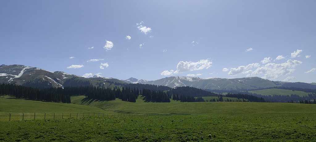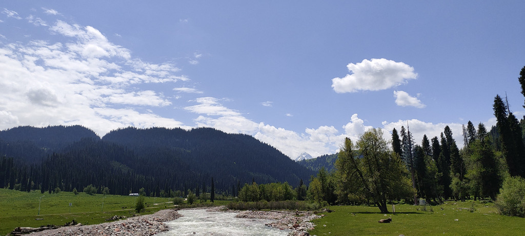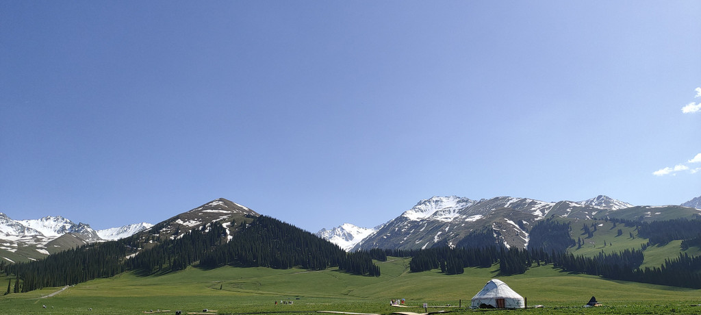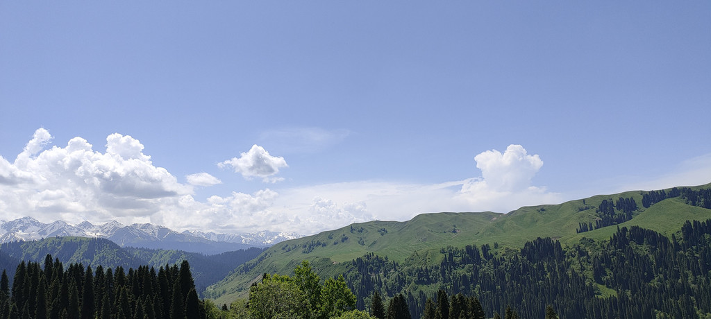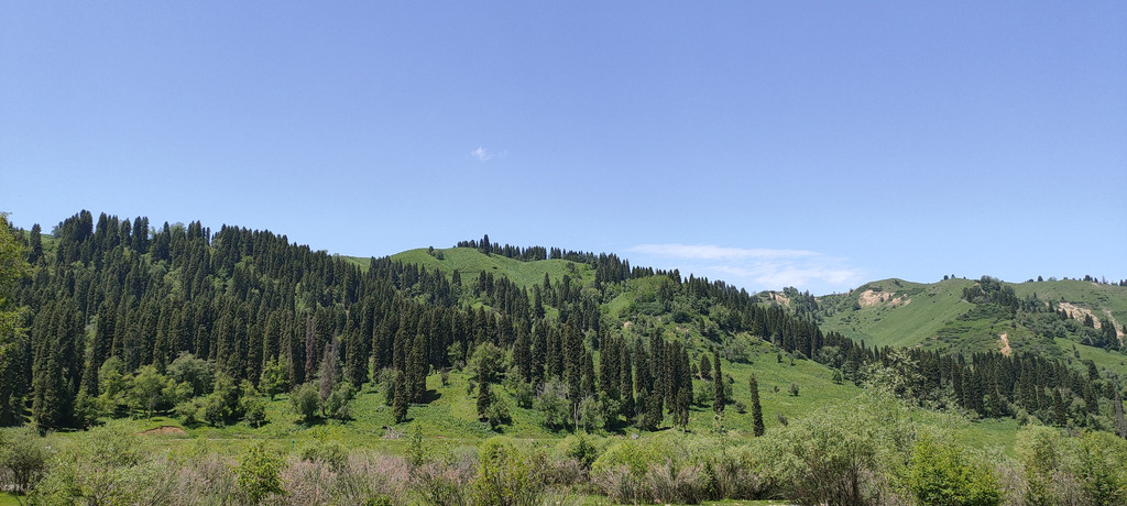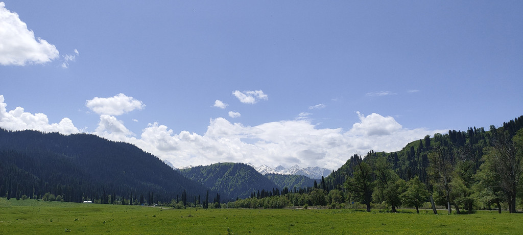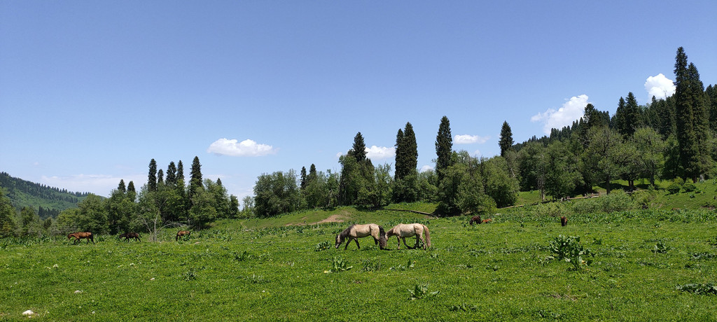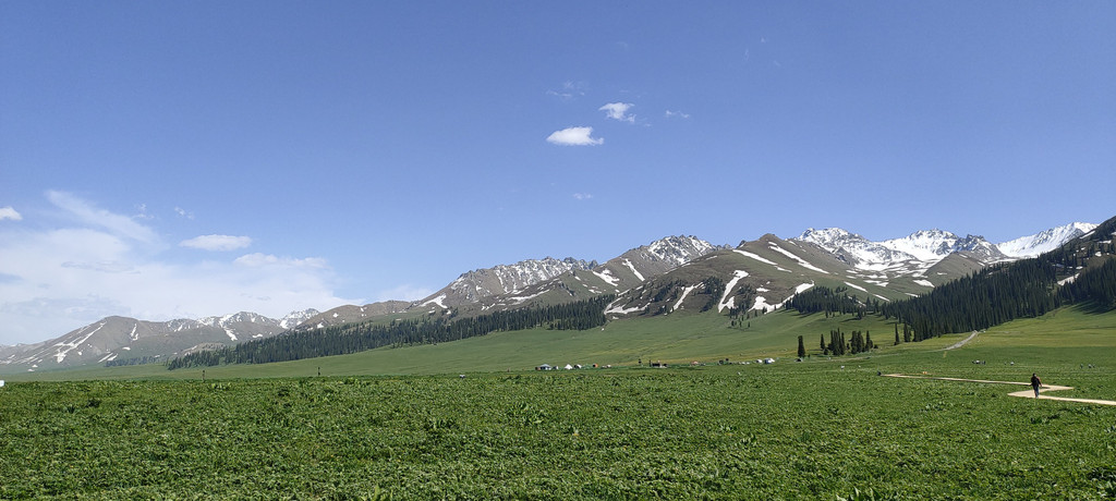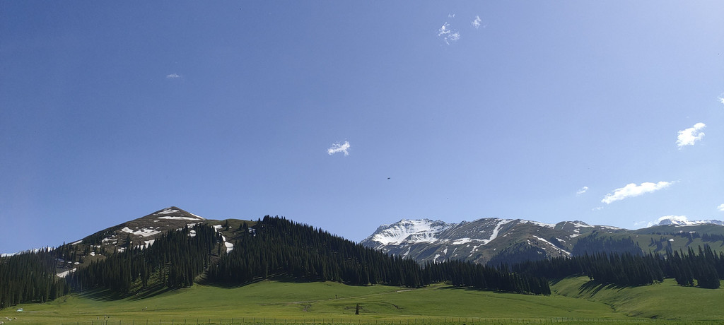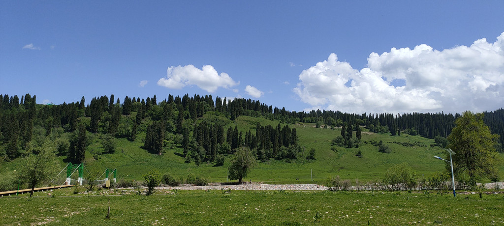 早晨十点,打包点干粮,备着好心情,一路经过霍城县(没错,就霍尔果斯口岸那)、新源县,果子沟大桥秘境,便打开一个蓝色的世界,嚯,这是真实存在的吗,雪山,蓝色的湖,雪杉,草原,仿佛是极不相称,确实融洽和谐,有点瓦尔登湖那味儿。