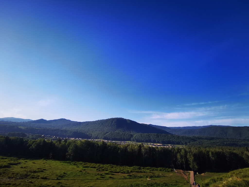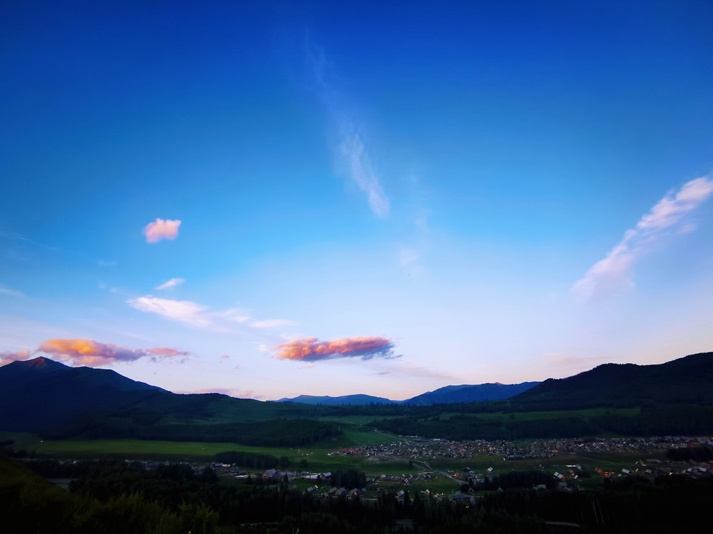傍晚时分,人渐少,我们简单吃完晚餐,经过禾木桥,登上哈登平台,一览禾木村全景,这个时候平台上的人很少,还有一丝凉意,要注意保暖。哈登平台是观日出看晨雾的,如果要看日落,需要乘车到区间车终点站,再步行木栈道几公里。由于晨雾的形成需要有大量的水汽,一般前一天如果为雨天,第二天清晨晨雾形成的几率较高,而今天是个大晴天,看日出晨雾需要起得很早,我们综合考虑晨雾几率低,故决定好好美美睡一觉,就不赶早了。
