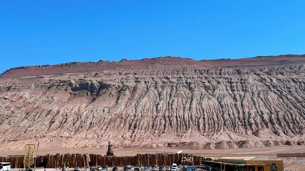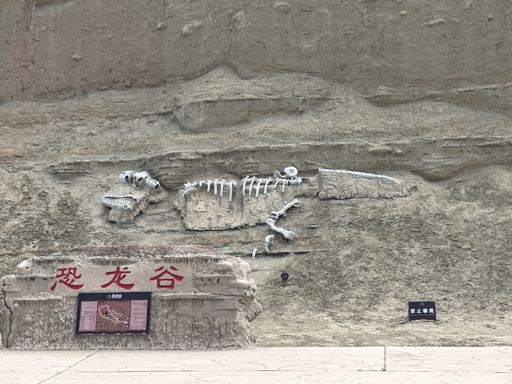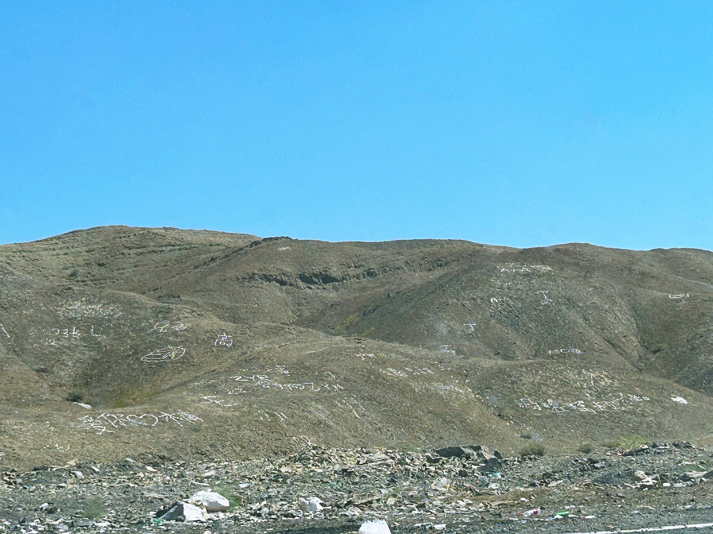 托克逊饱餐一顿,继续前行,将会经过一段寸草不生、极度干旱的干沟路段,周边的荒凉和干枯,会让人敬畏,沿路的荒芜不时会发现路旁有人使用白色小石头在荒芜的山坡上摆出各种符号、文字或图案等,给荒芜的路程多一点生气。