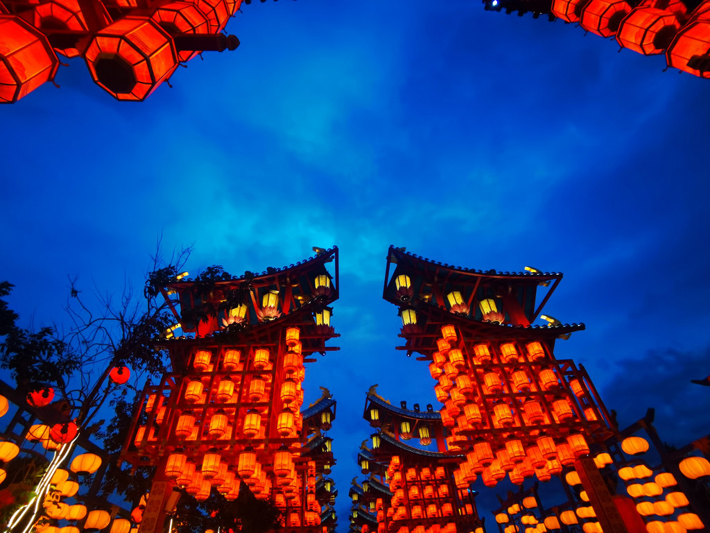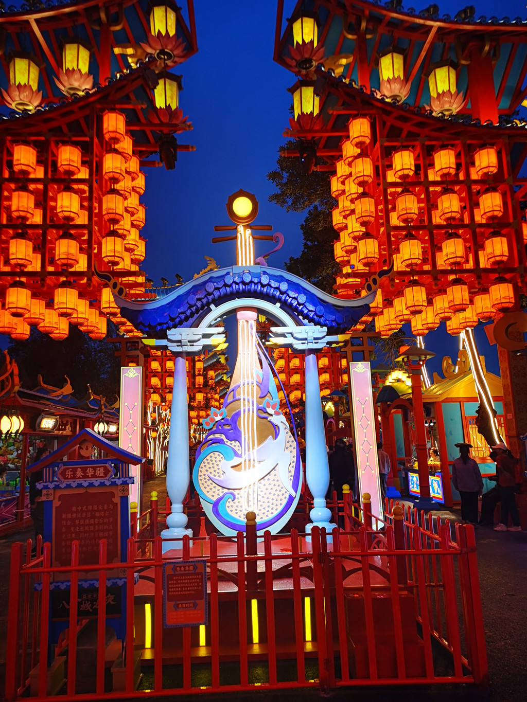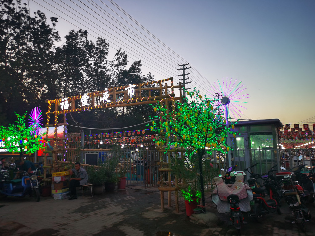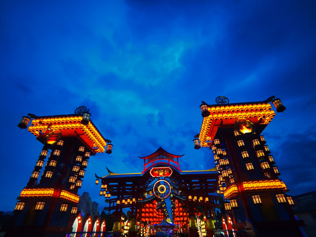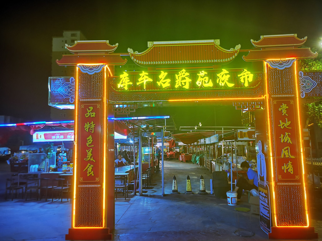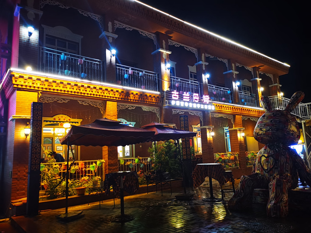 晚上的特克斯亮起了灯,可惜特克斯附近没有一个可以看到特克斯全景的高点,不然就可以看到一个美丽的大八卦,虽说城外有个八卦之眼摩天轮,但看网上从摩天轮拍的照片都只能是八卦城的一角而已;如果想看八卦城的全景,那一定得带上无人机哦,报备好,一览美丽的八卦城夜景。暑期的特克斯晚上有一个令人惊艳的夜市步行街-八卦城之夜,我更喜欢叫它八卦不夜城,充满唐风的场景,伴随着异域风情歌舞,满眼流光溢彩,还有各地美食,近600米的街区,美轮美奂的国潮夜市,很不错,即使晚上下起了雨,游人们仍热情不减。