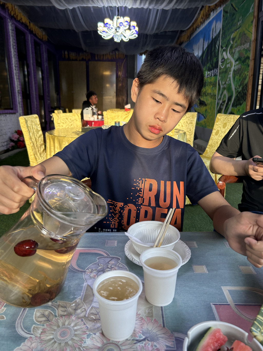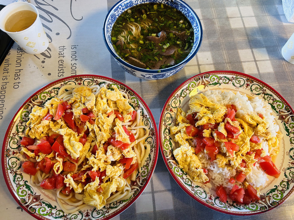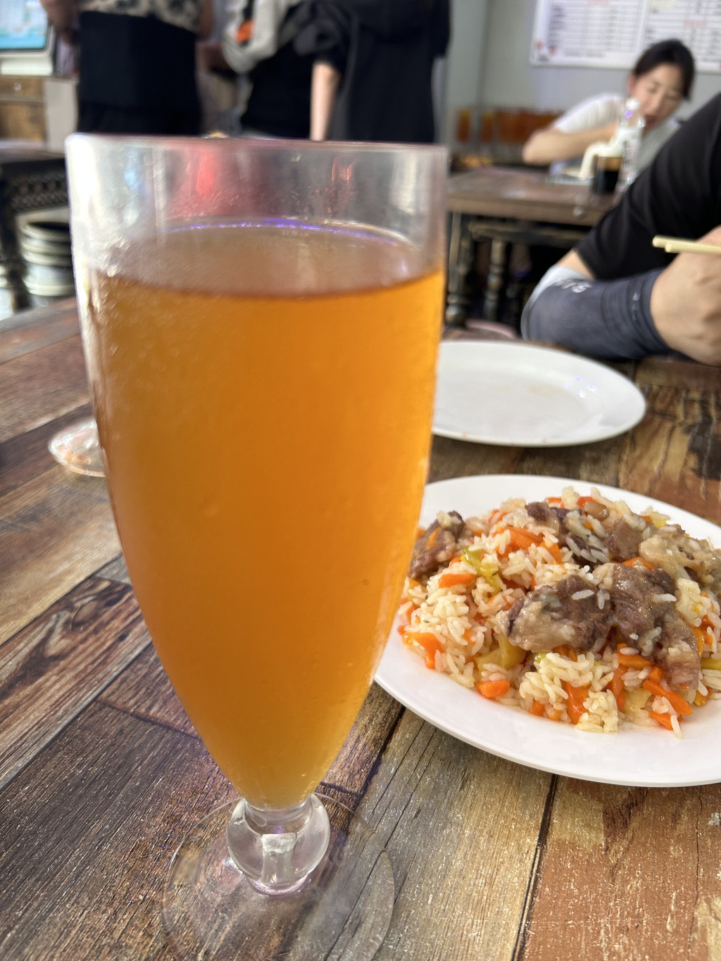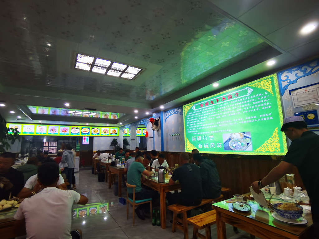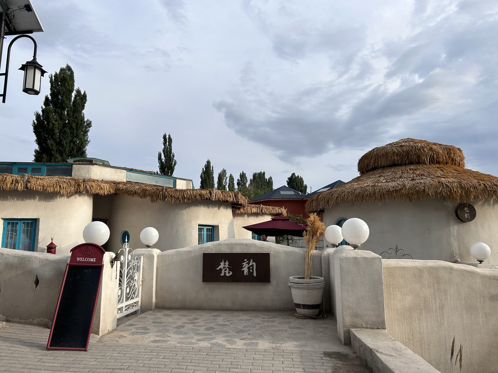 下午16时前,驱车3个半小时左右到达库尔勒,本想来库尔勒买库尔勒香梨的,可惜问了当地商店,才发现库尔勒香梨要9月份才成熟,晚餐就在库尔勒的葡萄树下麦西来甫,库车珍珠炒面、大盘鸡、喀什土鸽汤、和田酸奶粽子,样样都不错,不踩雷,推荐。饭后驱车离开时路过库尔勒大巴扎百姓市场,很热闹,很多美食摊位,可惜我们已吃饱,下次有缘再会吧。从库尔勒继续驱车大约1.5小时到达今天的休息点-和硕和顺酒店,具体高速口很近,旁边就是加油站,很方便第二天的出行,作为中转酒店很合适。