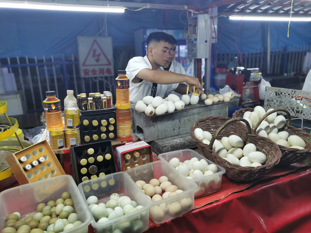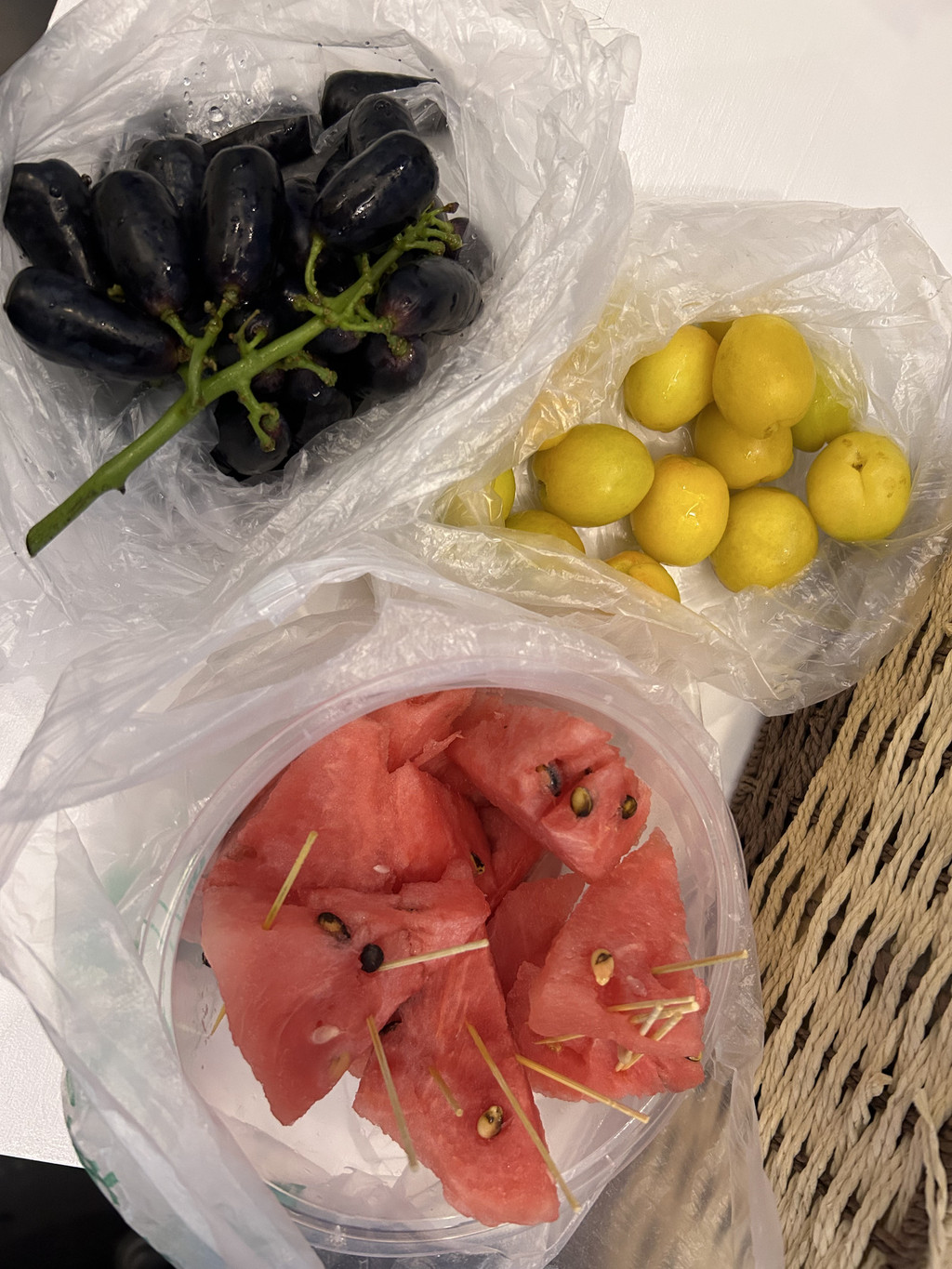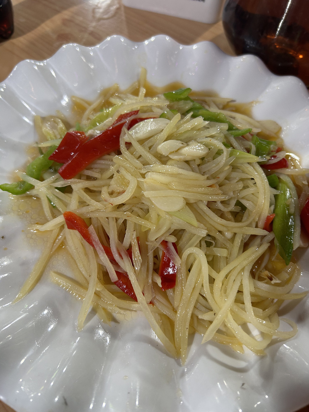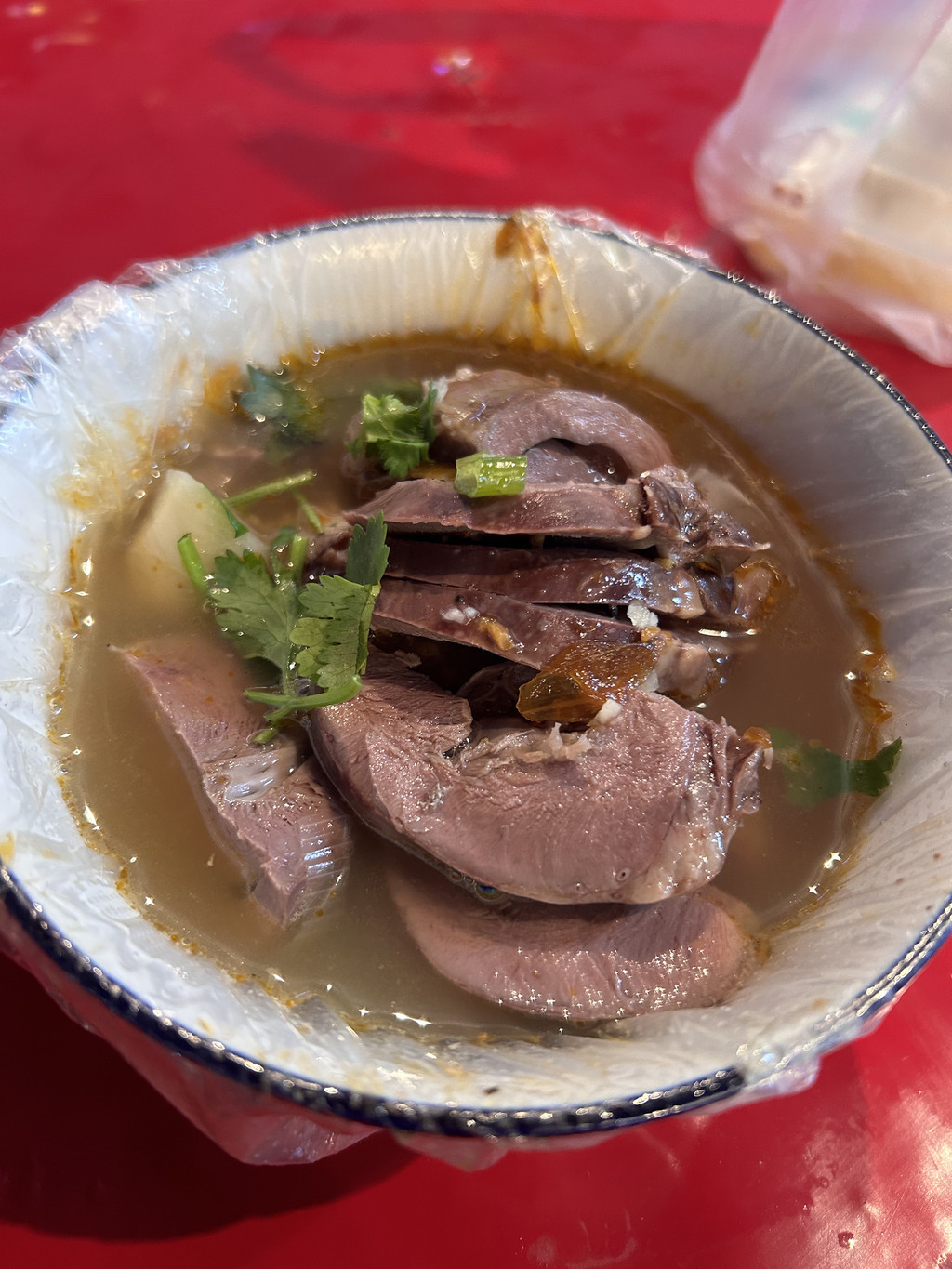 下午16时前,驱车3个半小时左右到达库尔勒,本想来库尔勒买库尔勒香梨的,可惜问了当地商店,才发现库尔勒香梨要9月份才成熟,晚餐就在库尔勒的葡萄树下麦西来甫,库车珍珠炒面、大盘鸡、喀什土鸽汤、和田酸奶粽子,样样都不错,不踩雷,推荐。饭后驱车离开时路过库尔勒大巴扎百姓市场,很热闹,很多美食摊位,可惜我们已吃饱,下次有缘再会吧。从库尔勒继续驱车大约1.5小时到达今天的休息点-和硕和顺酒店,具体高速口很近,旁边就是加油站,很方便第二天的出行,作为中转酒店很合适。