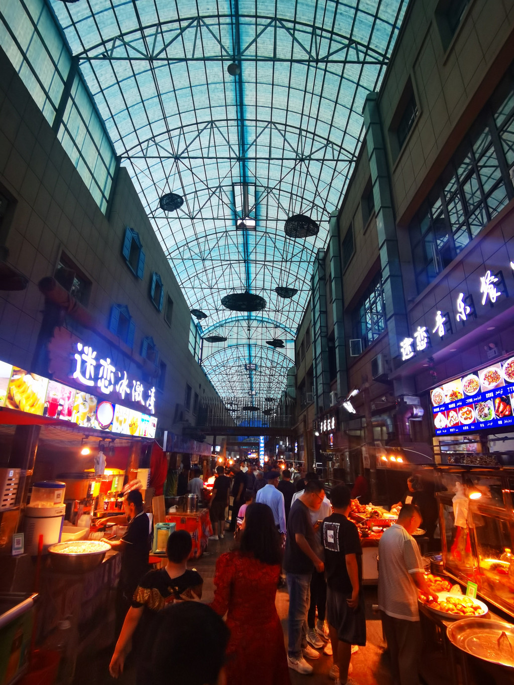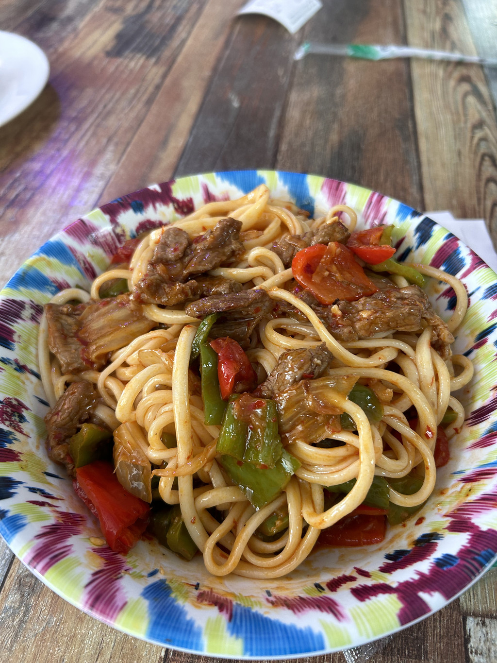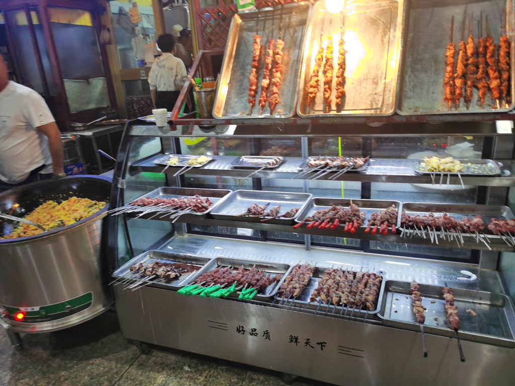 今天逛了一天,用脚感受了伊宁城市的美,着实还是有点累哈,回酒店休息充电,这一充电给充到了太阳下山啦,哈哈有点充过头了,驱车到汉人街美食大巴扎觅食,美食大巴扎内好多各种新疆美食摊位,琳琅满目,虽然游客挺多的,但这里的物价实惠,分量很足,味道谈不上惊艳,但是没有踩雷,是个吃食的选择。
