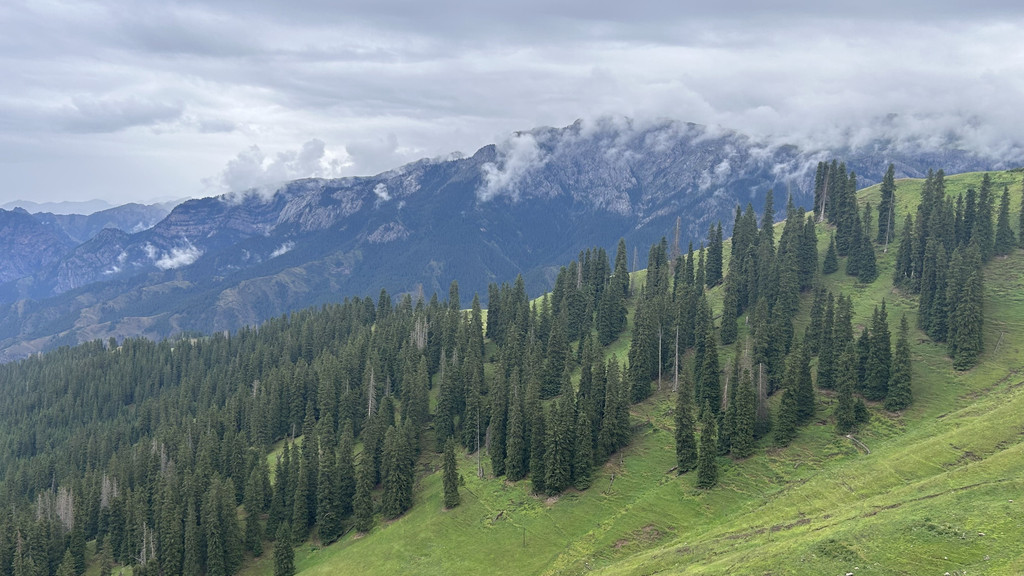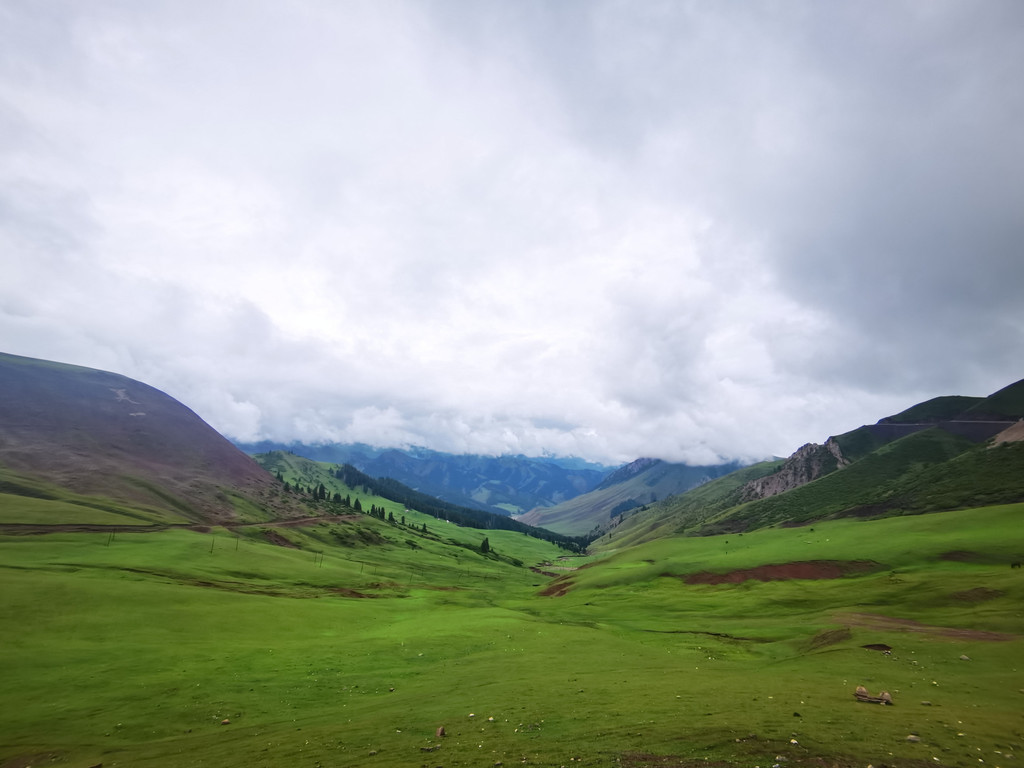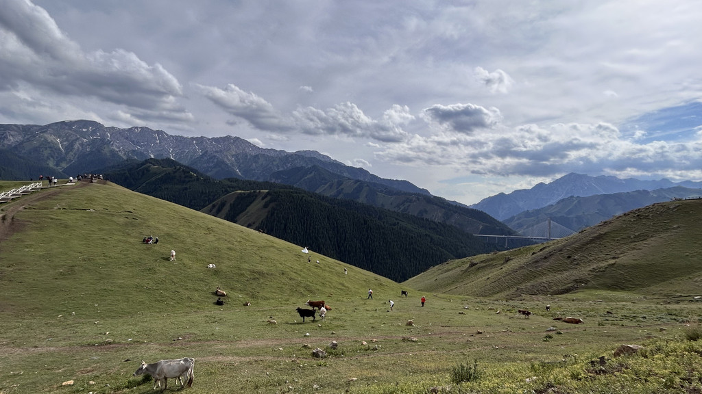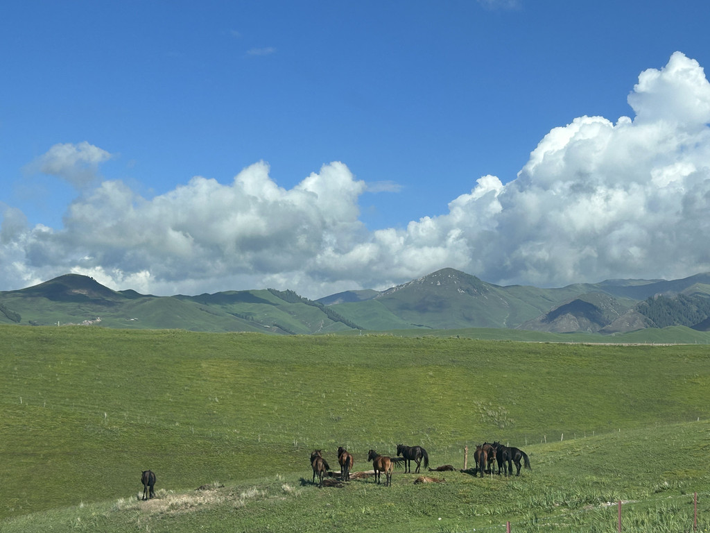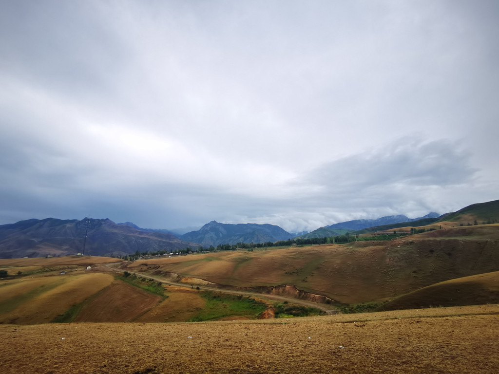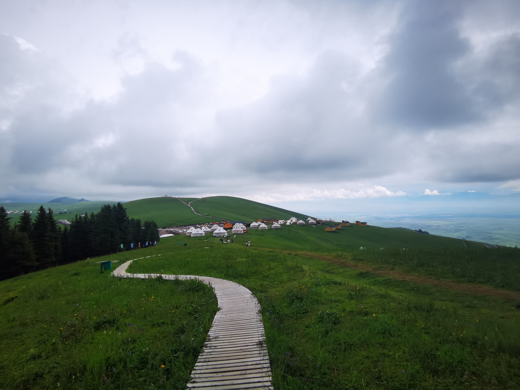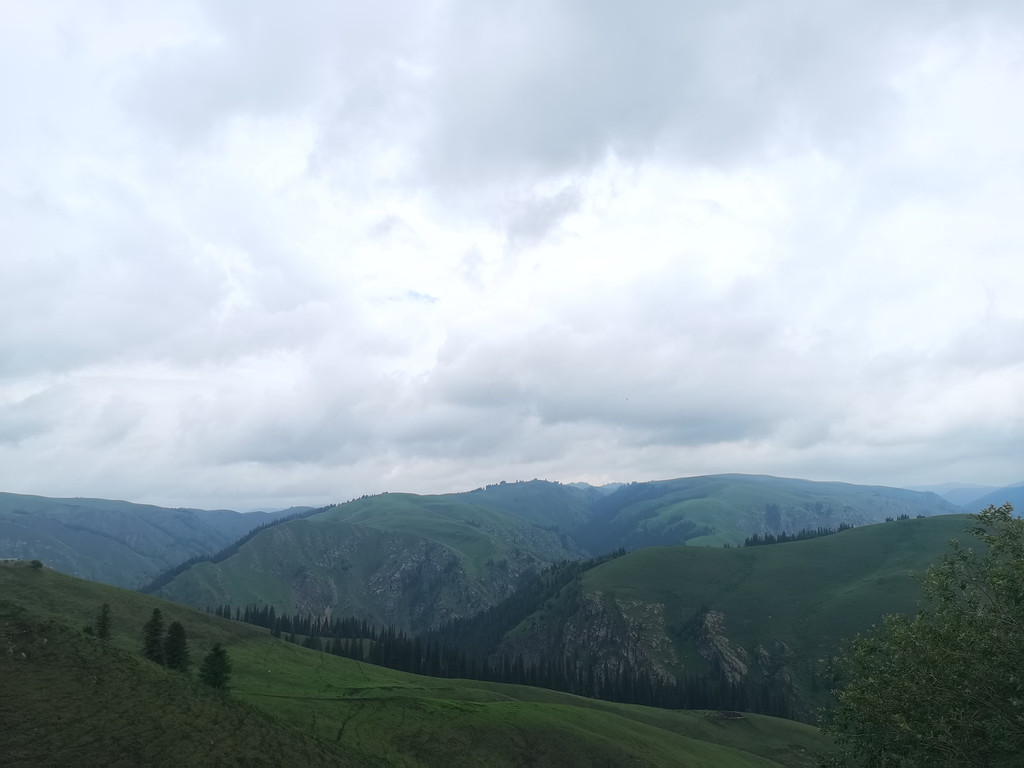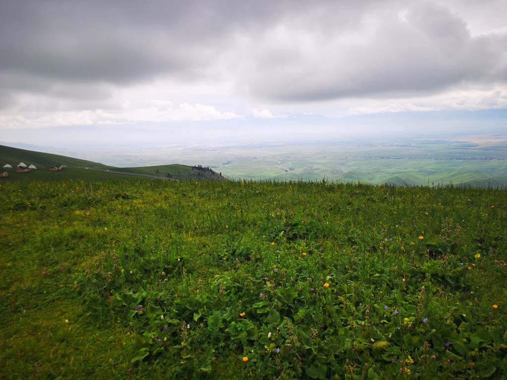 中午时分到达依据乾坤八卦图建造的八卦城特克斯,城内没有红绿灯,但通过八卦规划车辆行驶井然有序,很是神奇;办理好民宿入住后,在附近美食街的红玫餐厅解决中午饭后,驱车前往距离特克斯一小时车程的小众景点阿克塔斯草原,处于还在开发中的姑娘峰景区内,路已修好很好走,还未开始对外收费,只要在景区入口服务中心,进行车辆和身份登记后就可以驱车进入,需要环山而上,高山草原视野很好;可惜我们出发时还是晴天,一路到达草原时已经乌云密布,草原上没走一会便开始下起了雨,等候近1小时仍不见转晴,只能遗憾没能看到草原的美景,驱车下山回特克斯了。