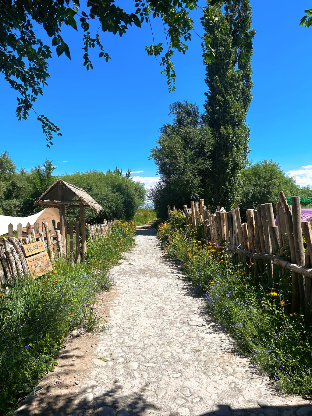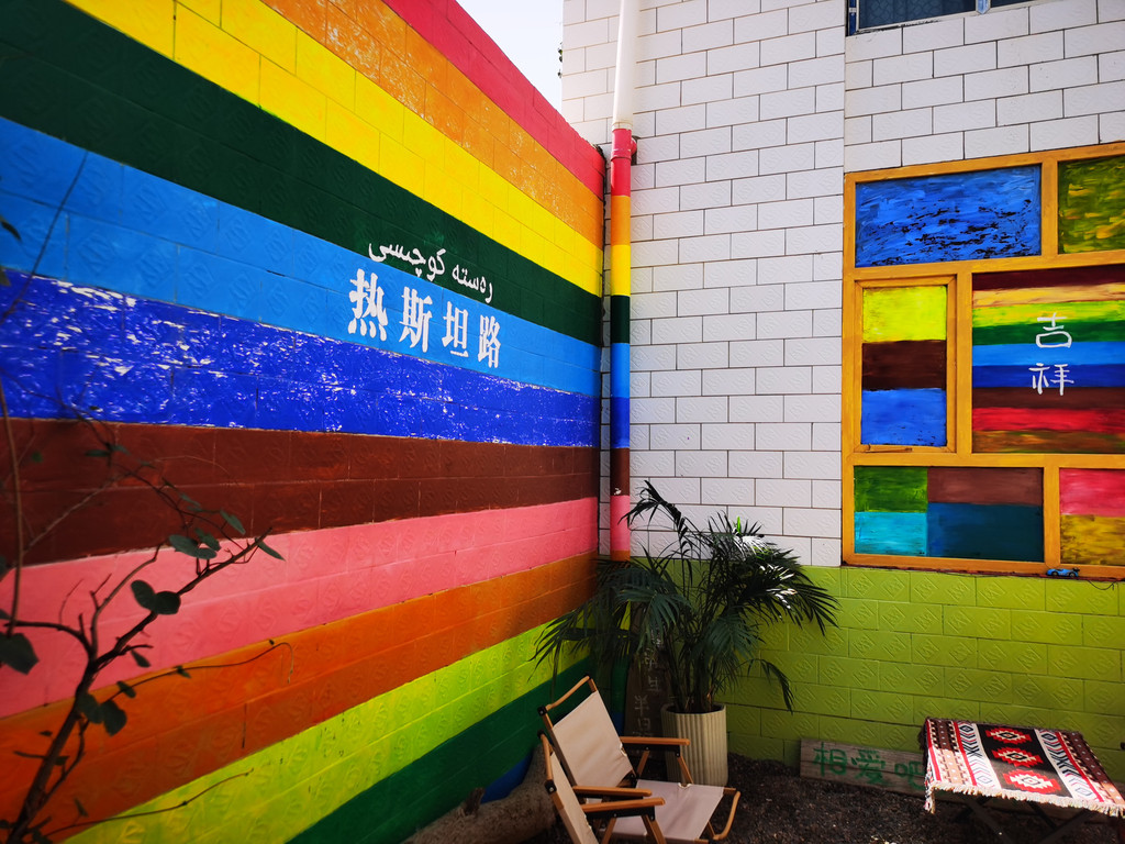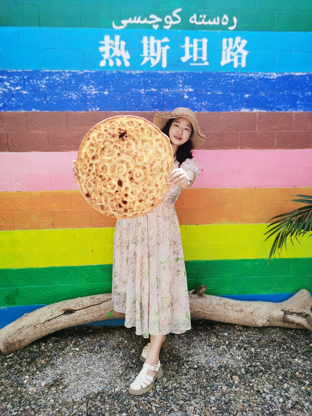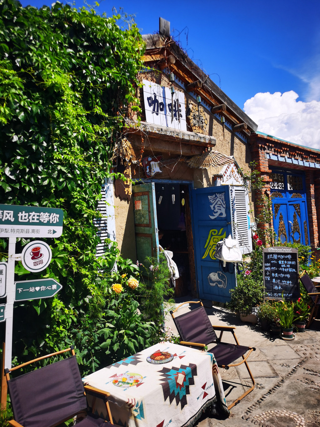 在阿克塔斯各种拍拍拍,待了近2小时,慢慢的游人渐多,我们也打到回府了,回到特克斯,决定去昨晚匆匆走过的特克斯网红街-离街,白天好好的走走。特克斯离街位于特克斯县特克斯镇博斯坦街南端,是特克斯县“乾坤震巽坎离艮兑”八街之一,位于八个卦爻中的离卦位置,总长1700米,总面积约9.2万平方米,由七条巷道和多个特色院落组成。是集乌孙文化、丝路文化、草原文化、易经文化于一体的多民族文化风情街区。这里最出名的是各式墙绘,墙绘分布在离街各处,以及离街附近的民宿,寻找墙绘,游走在特色民宿街区,好多地方都很出片,就是我和祺哥找了好久,唯独没找到大馕图,算是一个遗憾吧。午餐选择了,离街邮局文化艺术品中心服务员大街推荐的当地名店马白开来特色羊排揪片子,店铺很大,食客非常多,可惜虽然名气大,但是这个羊排揪片子真的不如昨晚八号美食庭院的,羊排很老还有膻味,且汤油腻不爽口,踩雷了,大伙记得避开。