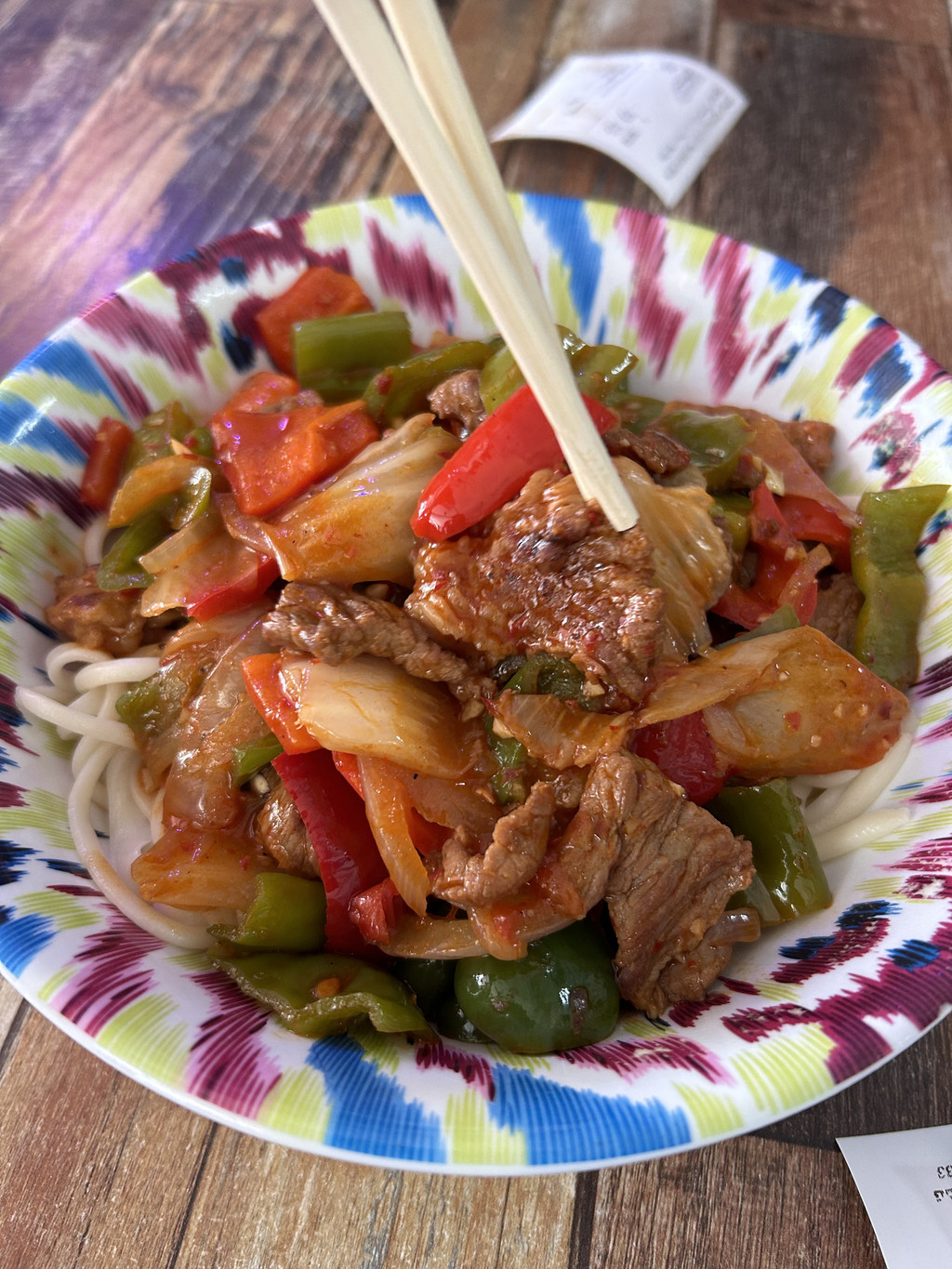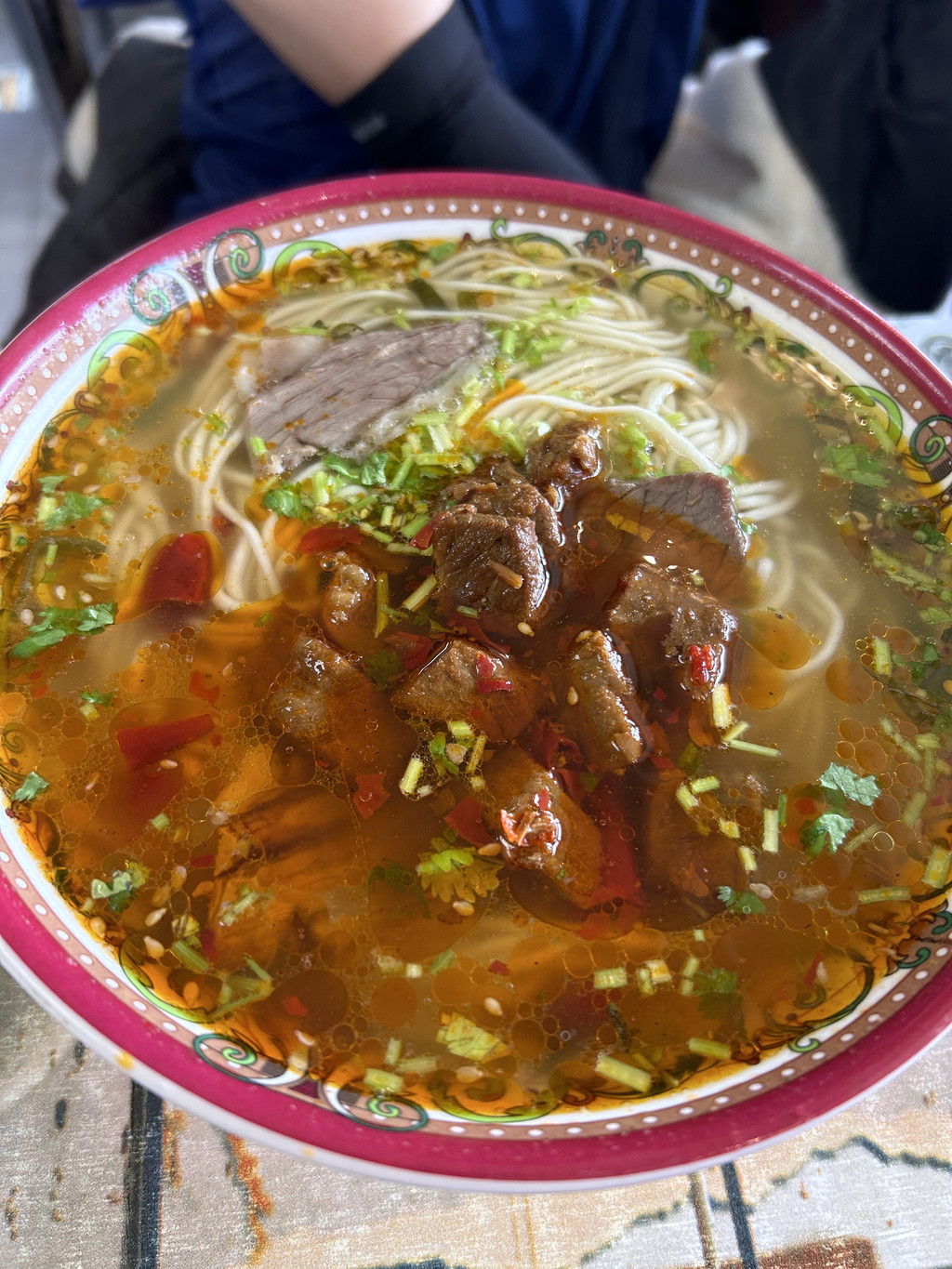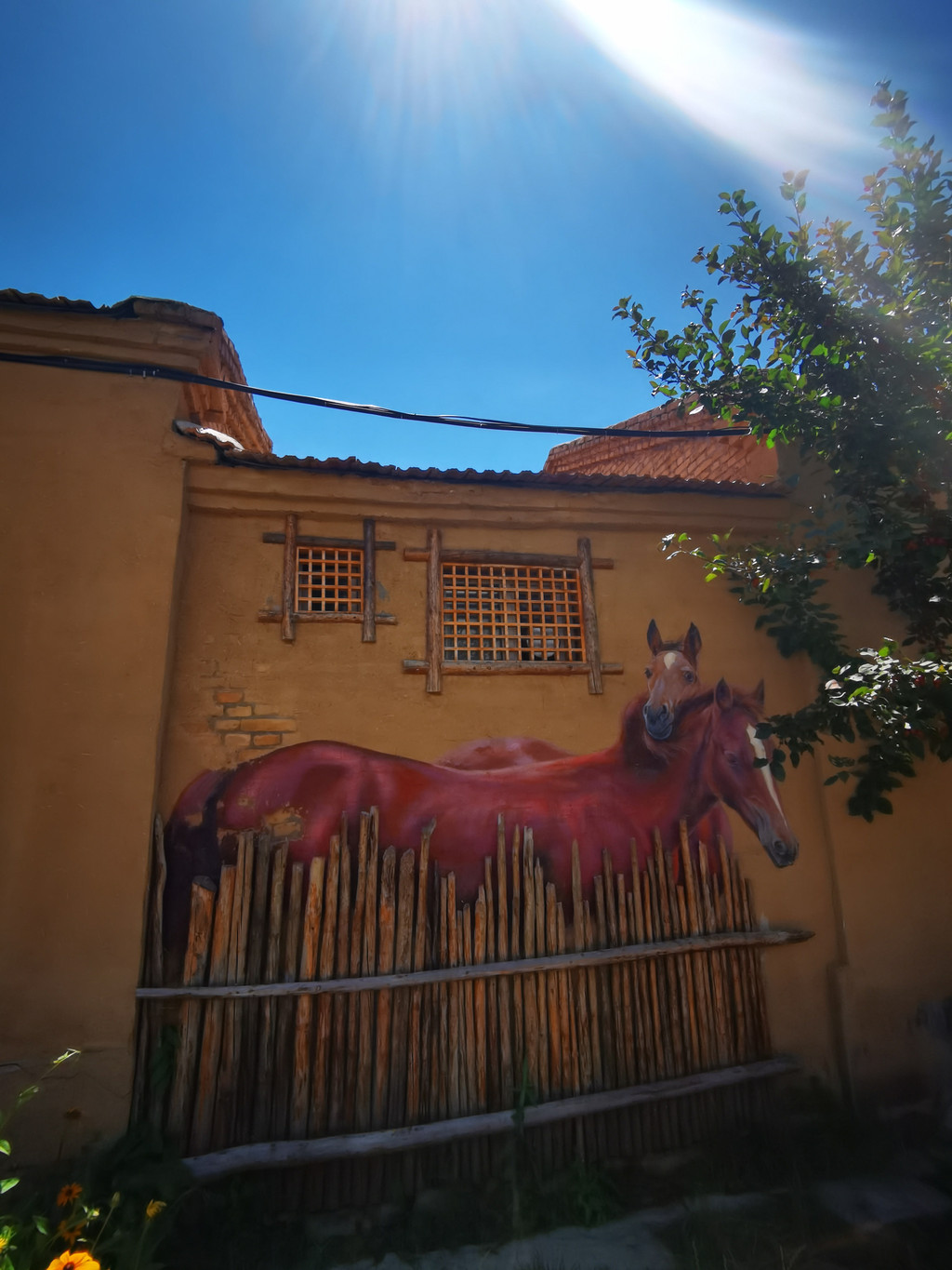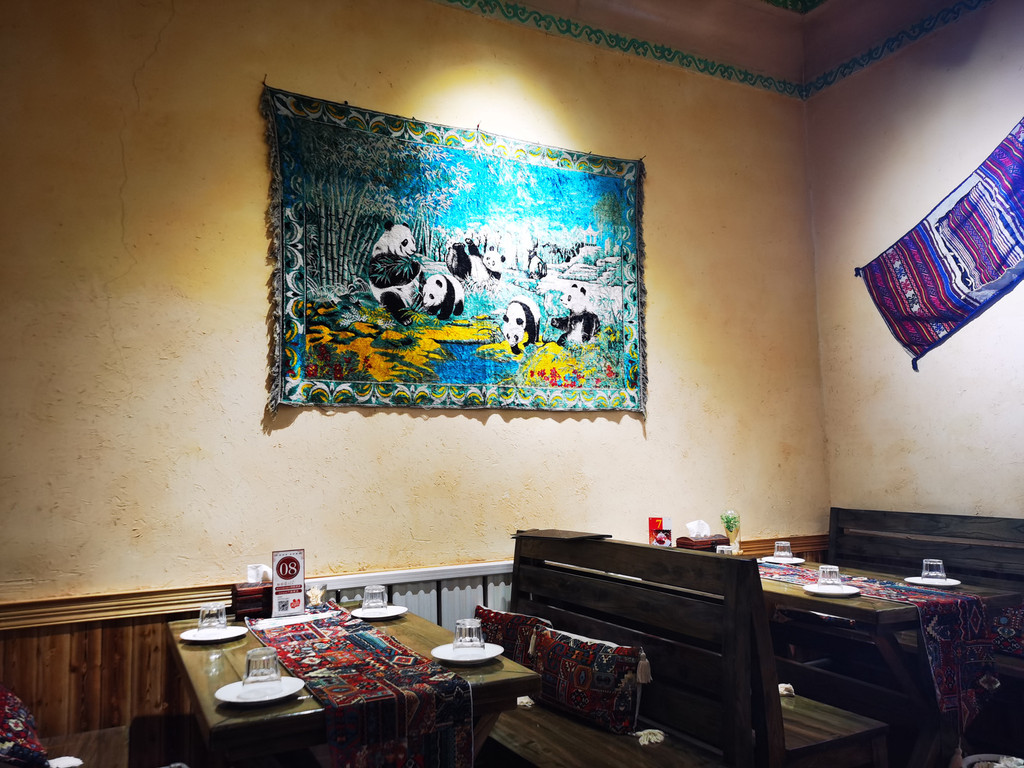 在阿克塔斯各种拍拍拍,待了近2小时,慢慢的游人渐多,我们也打到回府了,回到特克斯,决定去昨晚匆匆走过的特克斯网红街-离街,白天好好的走走。特克斯离街位于特克斯县特克斯镇博斯坦街南端,是特克斯县“乾坤震巽坎离艮兑”八街之一,位于八个卦爻中的离卦位置,总长1700米,总面积约9.2万平方米,由七条巷道和多个特色院落组成。是集乌孙文化、丝路文化、草原文化、易经文化于一体的多民族文化风情街区。这里最出名的是各式墙绘,墙绘分布在离街各处,以及离街附近的民宿,寻找墙绘,游走在特色民宿街区,好多地方都很出片,就是我和祺哥找了好久,唯独没找到大馕图,算是一个遗憾吧。午餐选择了,离街邮局文化艺术品中心服务员大街推荐的当地名店马白开来特色羊排揪片子,店铺很大,食客非常多,可惜虽然名气大,但是这个羊排揪片子真的不如昨晚八号美食庭院的,羊排很老还有膻味,且汤油腻不爽口,踩雷了,大伙记得避开。