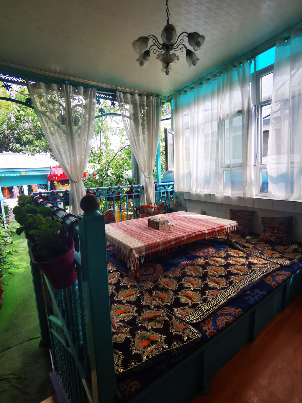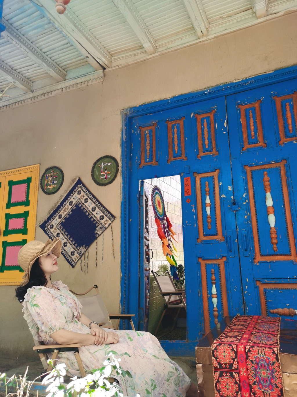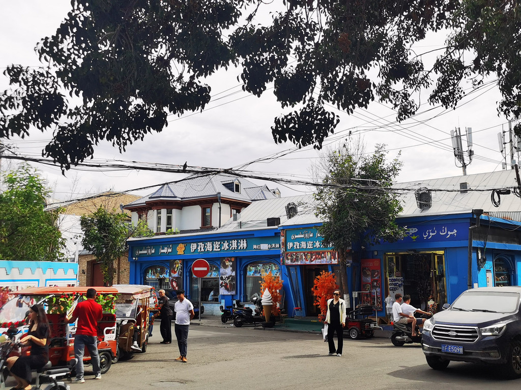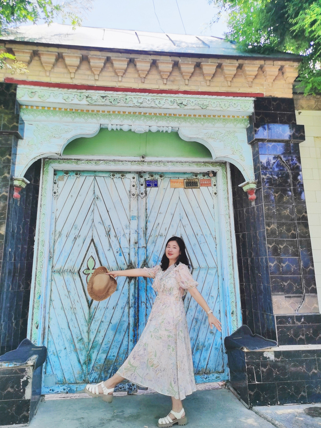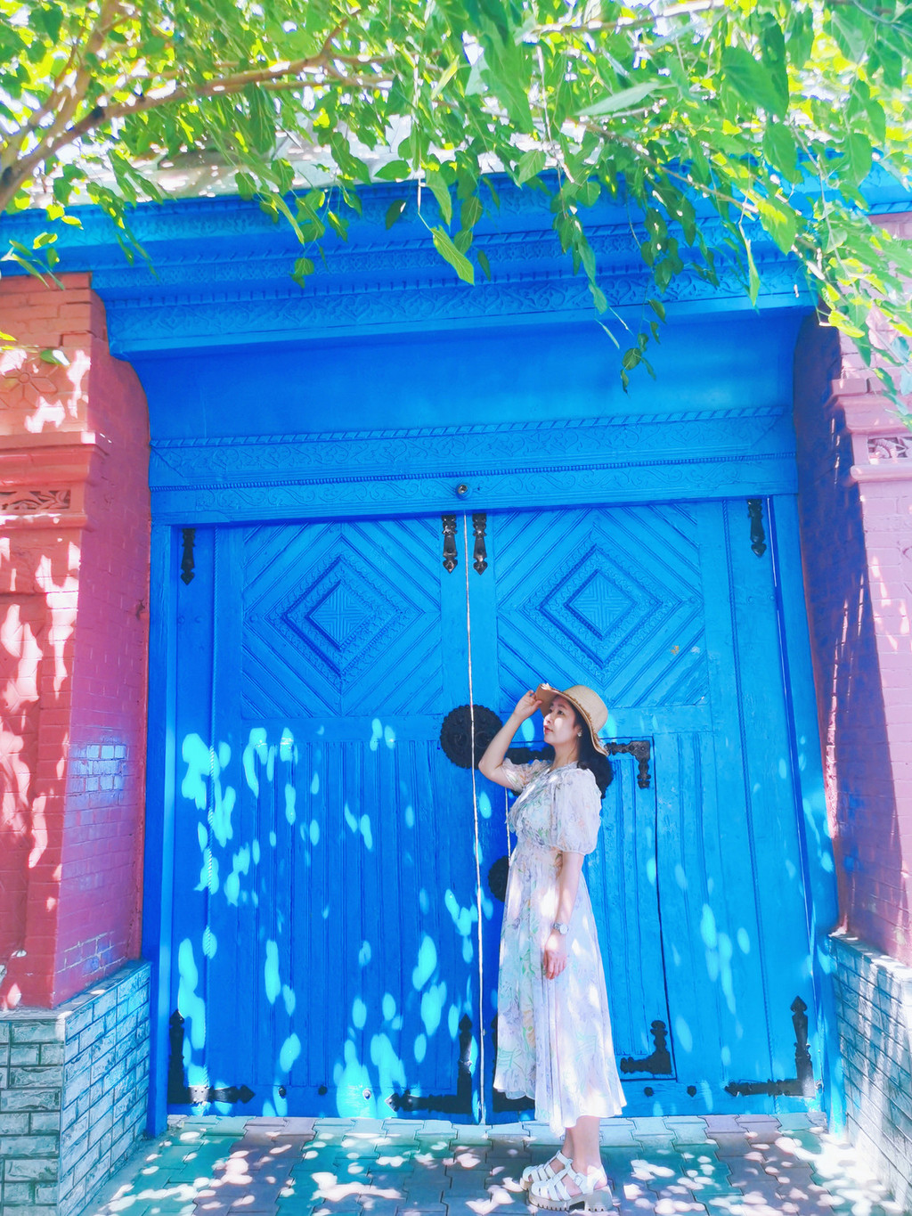 伊宁老城喀赞其,总面积约22.9平方公里,是以维吾尔族为主包含回族、哈萨克、乌兹别克族等少数民族聚居区,旅游区最大限度地保留原有的民居、民风、民情,所有民居和环境建设始终保持着百年前的传统风貌与格局,是一个以展示伊犁维吾尔民俗风情为主的原生态大型人文旅游景区;这里与六星街的不同之处是,更原生态,更能展现维族的风情。喀赞其是一个蓝色的海洋,随处可见蓝色房子,各式门窗,镶嵌在蓝色之中,非常的漂亮,置身其中宛如画中。整个区域非常大,里面生活了很多维族同胞,在不打扰并取得主人同意的情况下,可以进民居院里稍微参观,步行喀赞其是个体力活,建议乘坐三轮车或坐个马车逛逛,可以节省体力;我们步行了一段路,离开主路到各个小巷随意逛,人很少,拍了好多美照,累了路上叫了辆维族老伯的三轮车带我们逛一圈,三个人一辆车50元,大约逛了40多分钟;维族老伯很友善,我们让他帮我们带到看到的地方,让我们拍拍照,她开着三轮车很认真帮我们物色好看的维族院子,虽然可能他物色的好地方并一定全是我们中意的,但是仍然很感恩老伯一次次的带路和等候;维族老伯的普通话比较一般,沟通上一定程度有点困难,好在老伯也很聪明,每次我们听不懂他的话时,他都会寻找路过的维族年轻人帮他翻译,也挺有趣的哈。