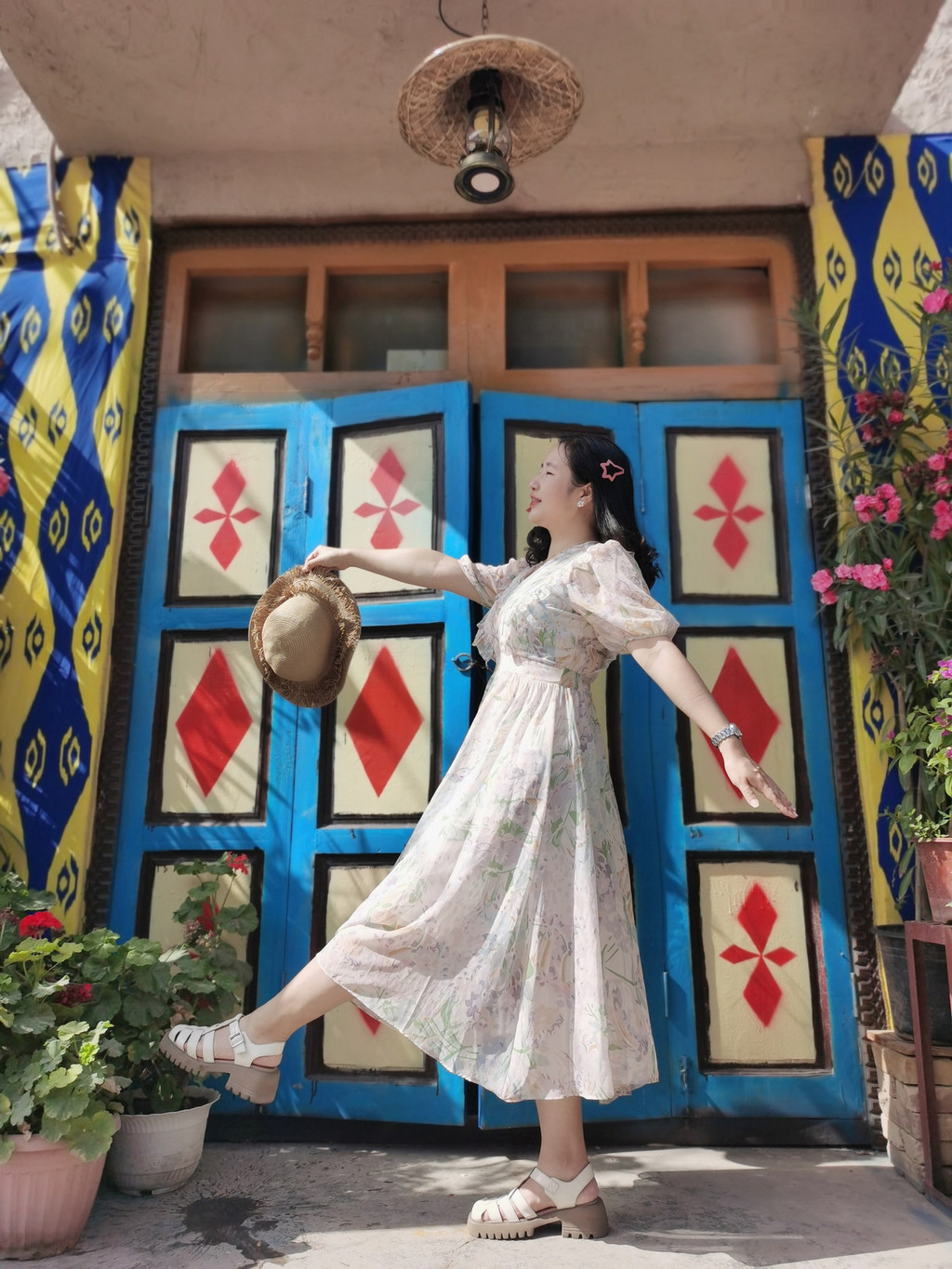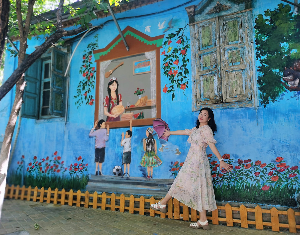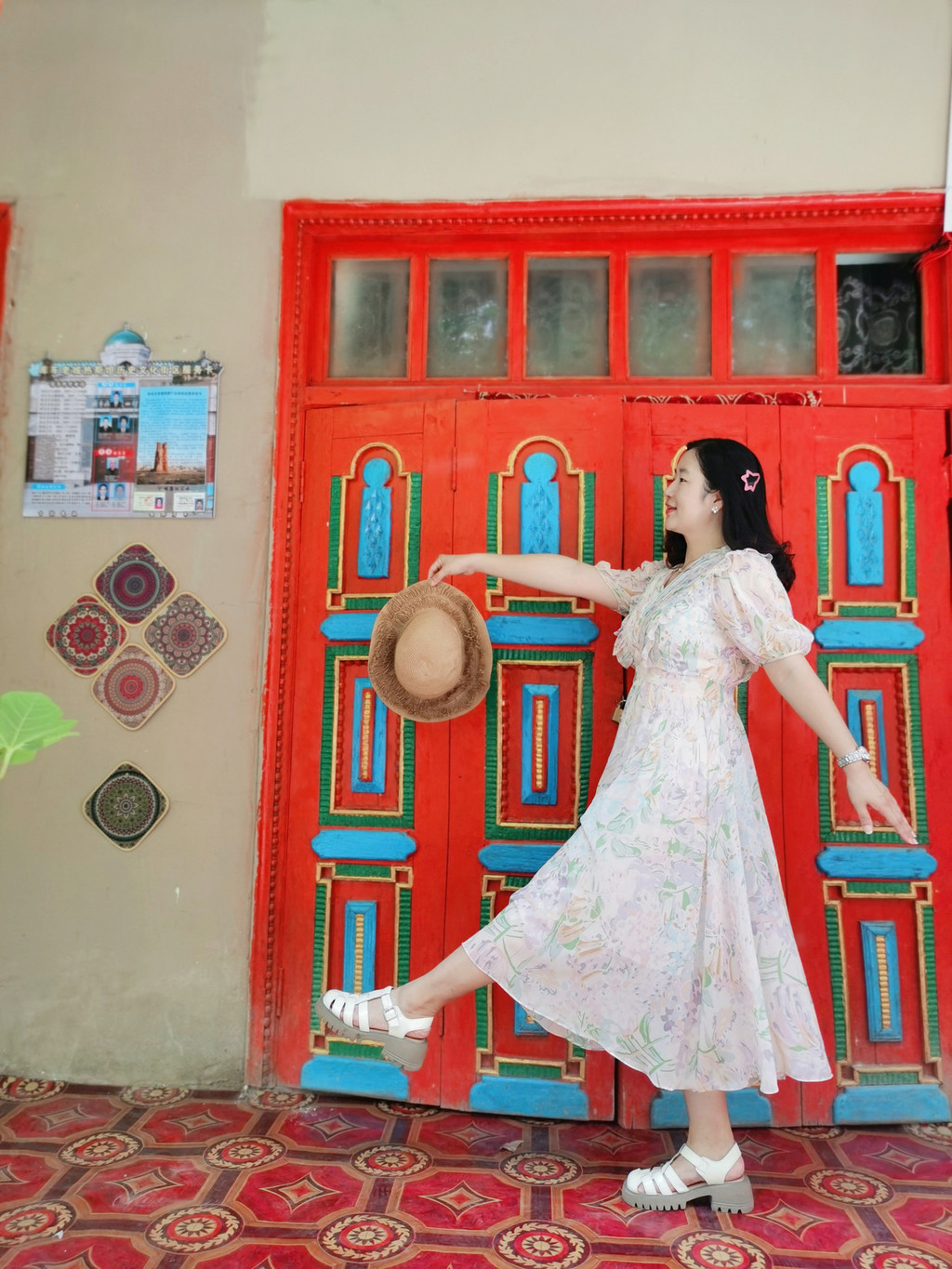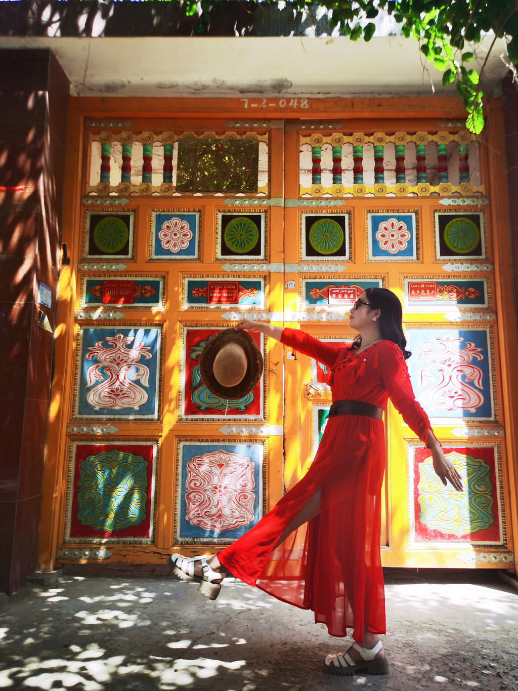 伊宁老城喀赞其,总面积约22.9平方公里,是以维吾尔族为主包含回族、哈萨克、乌兹别克族等少数民族聚居区,旅游区最大限度地保留原有的民居、民风、民情,所有民居和环境建设始终保持着百年前的传统风貌与格局,是一个以展示伊犁维吾尔民俗风情为主的原生态大型人文旅游景区;这里与六星街的不同之处是,更原生态,更能展现维族的风情。喀赞其是一个蓝色的海洋,随处可见蓝色房子,各式门窗,镶嵌在蓝色之中,非常的漂亮,置身其中宛如画中。整个区域非常大,里面生活了很多维族同胞,在不打扰并取得主人同意的情况下,可以进民居院里稍微参观,步行喀赞其是个体力活,建议乘坐三轮车或坐个马车逛逛,可以节省体力;我们步行了一段路,离开主路到各个小巷随意逛,人很少,拍了好多美照,累了路上叫了辆维族老伯的三轮车带我们逛一圈,三个人一辆车50元,大约逛了40多分钟;维族老伯很友善,我们让他帮我们带到看到的地方,让我们拍拍照,她开着三轮车很认真帮我们物色好看的维族院子,虽然可能他物色的好地方并一定全是我们中意的,但是仍然很感恩老伯一次次的带路和等候;维族老伯的普通话比较一般,沟通上一定程度有点困难,好在老伯也很聪明,每次我们听不懂他的话时,他都会寻找路过的维族年轻人帮他翻译,也挺有趣的哈。