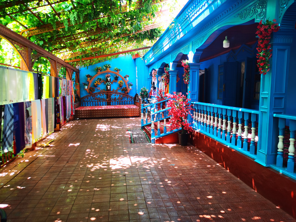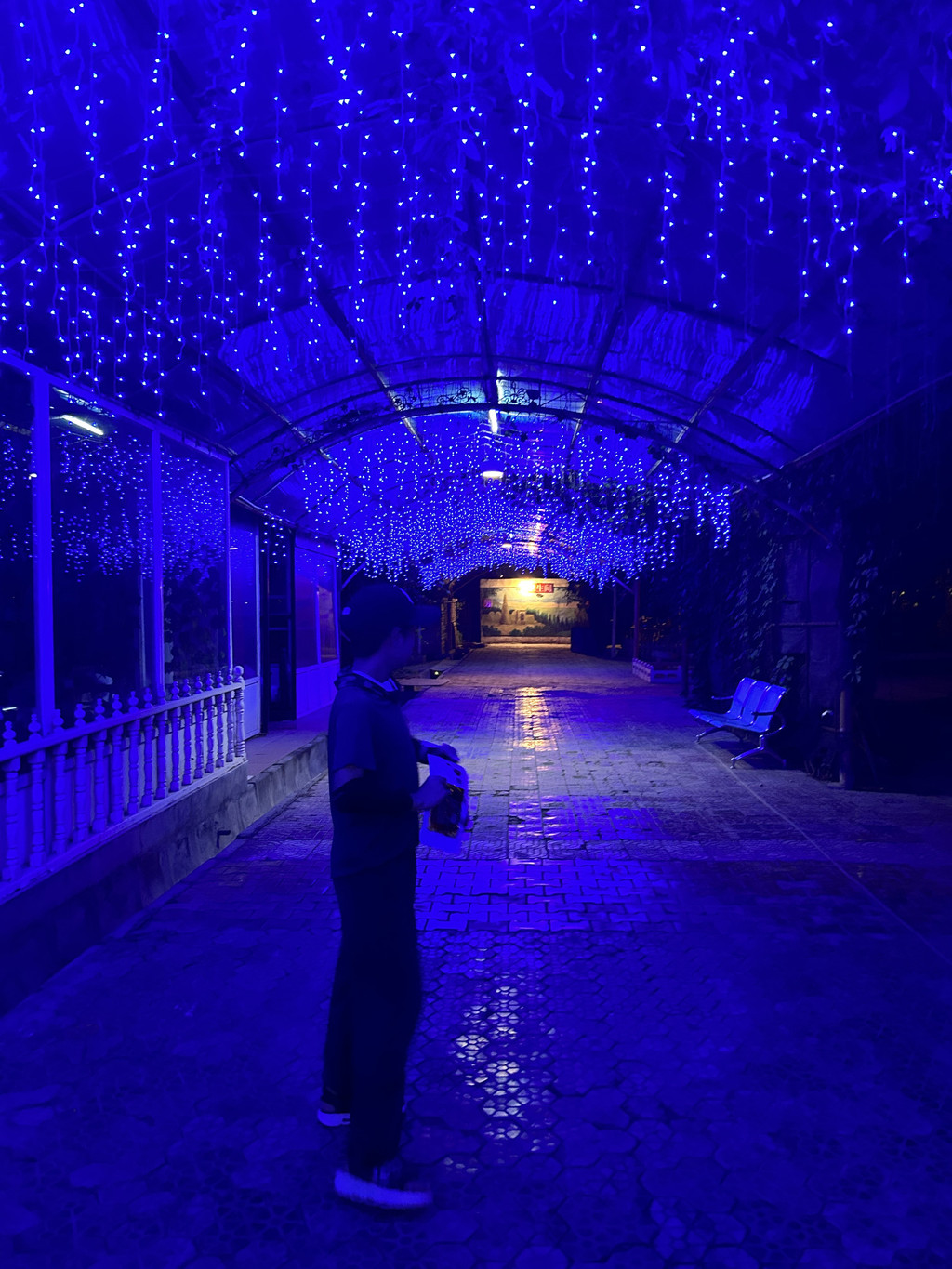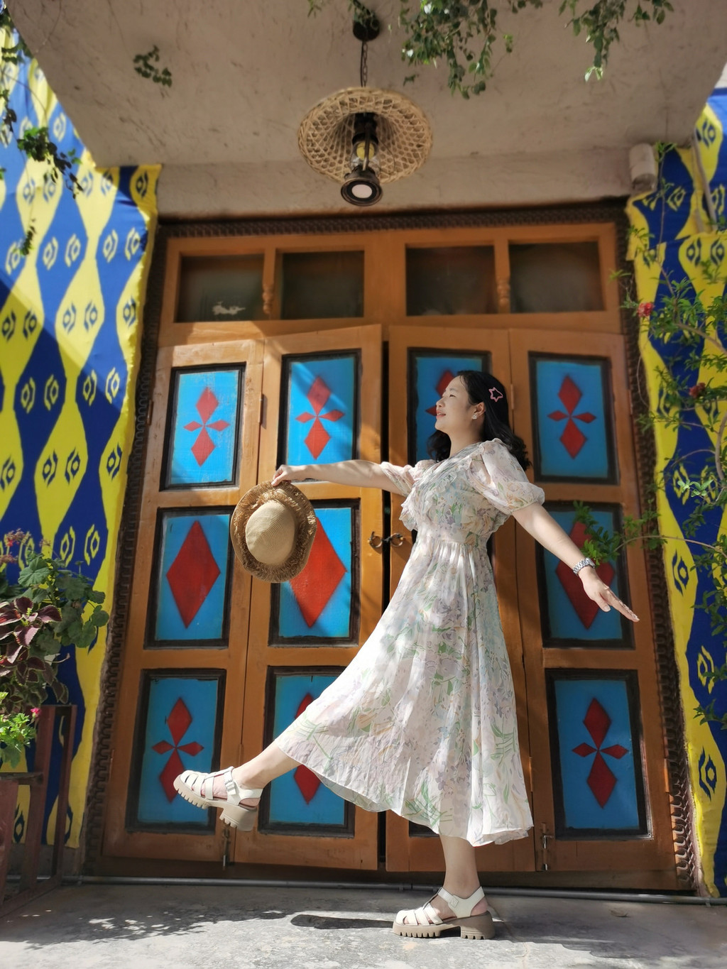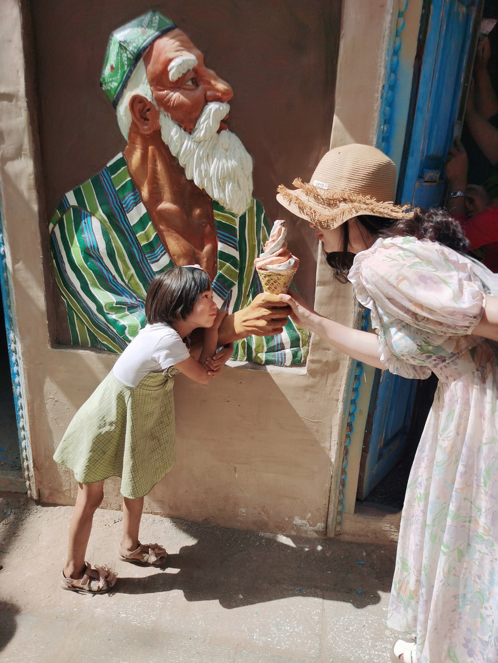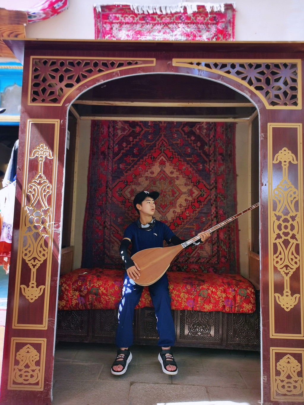 伊宁老城喀赞其,总面积约22.9平方公里,是以维吾尔族为主包含回族、哈萨克、乌兹别克族等少数民族聚居区,旅游区最大限度地保留原有的民居、民风、民情,所有民居和环境建设始终保持着百年前的传统风貌与格局,是一个以展示伊犁维吾尔民俗风情为主的原生态大型人文旅游景区;这里与六星街的不同之处是,更原生态,更能展现维族的风情。喀赞其是一个蓝色的海洋,随处可见蓝色房子,各式门窗,镶嵌在蓝色之中,非常的漂亮,置身其中宛如画中。整个区域非常大,里面生活了很多维族同胞,在不打扰并取得主人同意的情况下,可以进民居院里稍微参观,步行喀赞其是个体力活,建议乘坐三轮车或坐个马车逛逛,可以节省体力;我们步行了一段路,离开主路到各个小巷随意逛,人很少,拍了好多美照,累了路上叫了辆维族老伯的三轮车带我们逛一圈,三个人一辆车50元,大约逛了40多分钟;维族老伯很友善,我们让他帮我们带到看到的地方,让我们拍拍照,她开着三轮车很认真帮我们物色好看的维族院子,虽然可能他物色的好地方并一定全是我们中意的,但是仍然很感恩老伯一次次的带路和等候;维族老伯的普通话比较一般,沟通上一定程度有点困难,好在老伯也很聪明,每次我们听不懂他的话时,他都会寻找路过的维族年轻人帮他翻译,也挺有趣的哈。