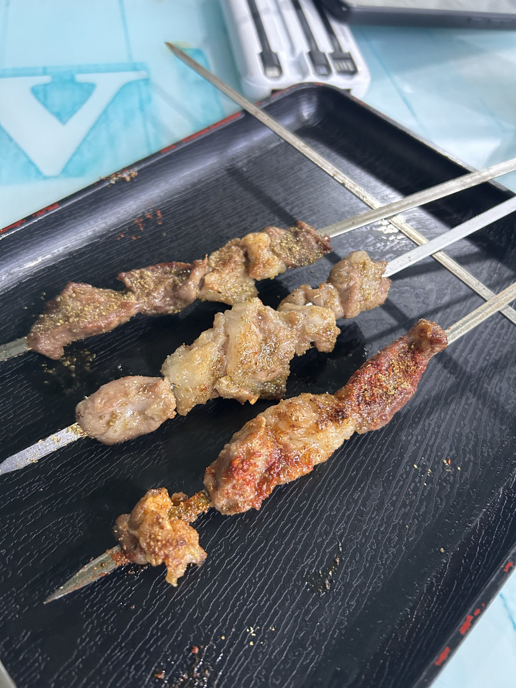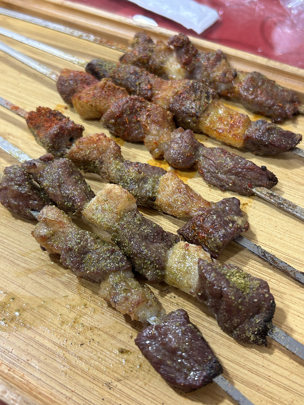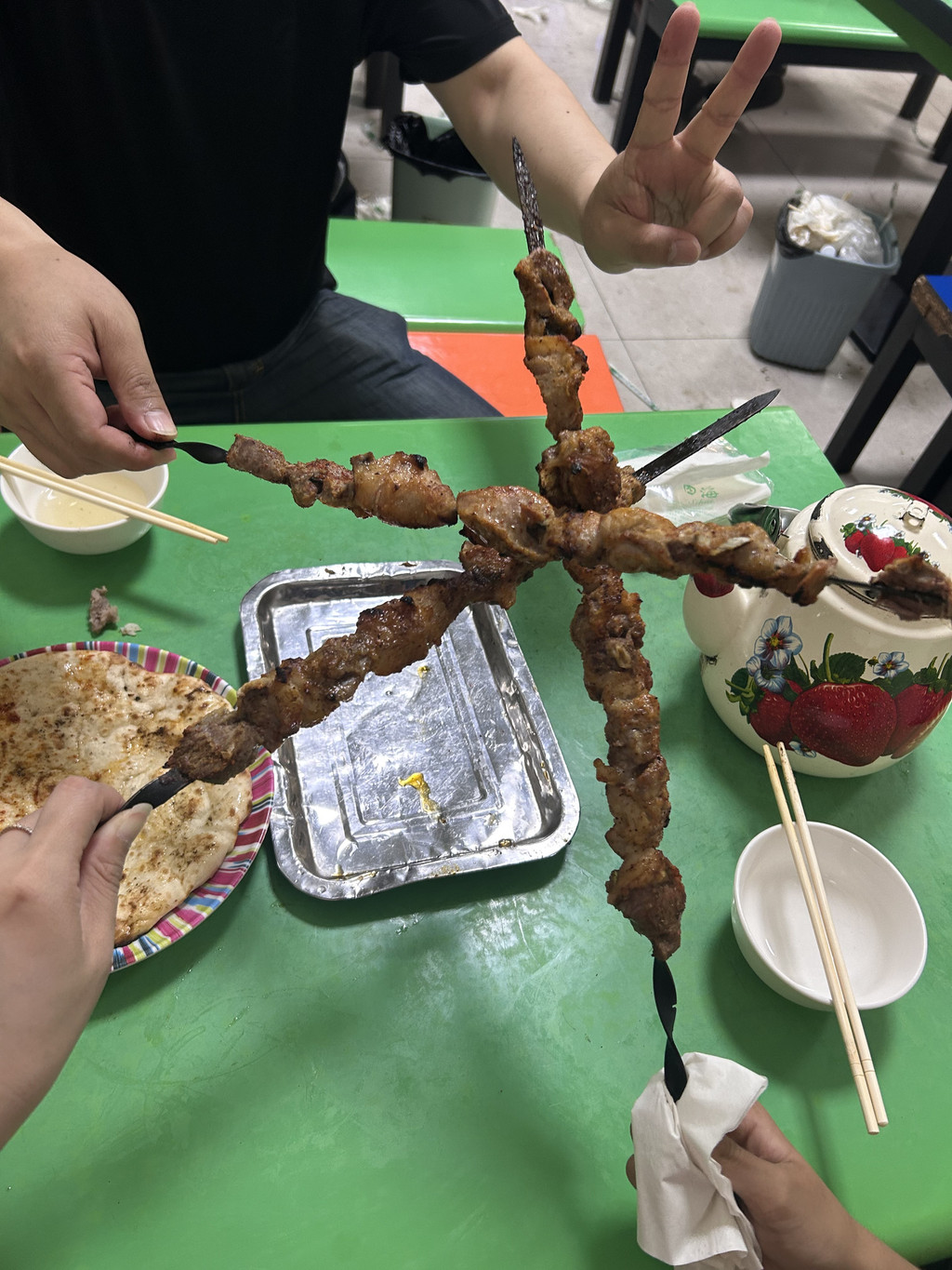 晚上前往库车当地人常逛的乌恰夜市觅食,这里各色新疆美食,琳琅满目,香气四溢,很有烟火气,吾麦尔烤鸡腿、新疆麻辣串串、现烤鹅蛋、新疆麻辣披萨、库麦其馕、烤包子、炖羊心、肚包肉等等,总花费不到100元,价格实惠,强烈推荐。