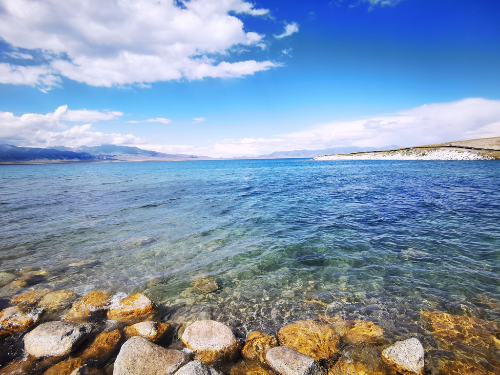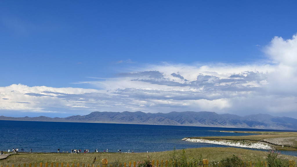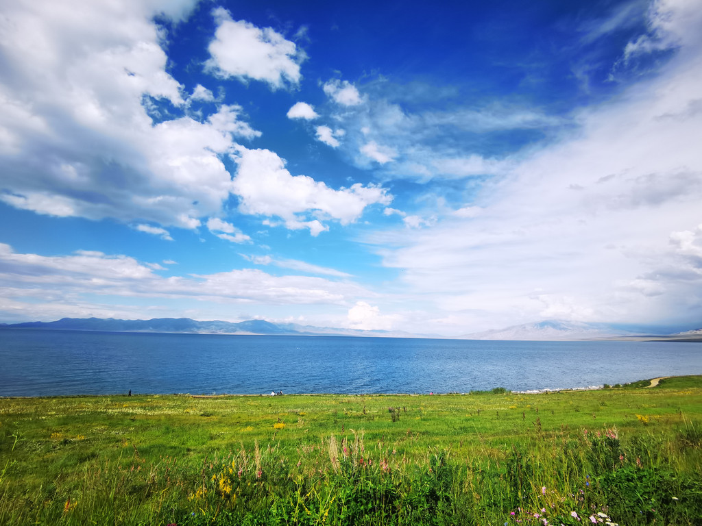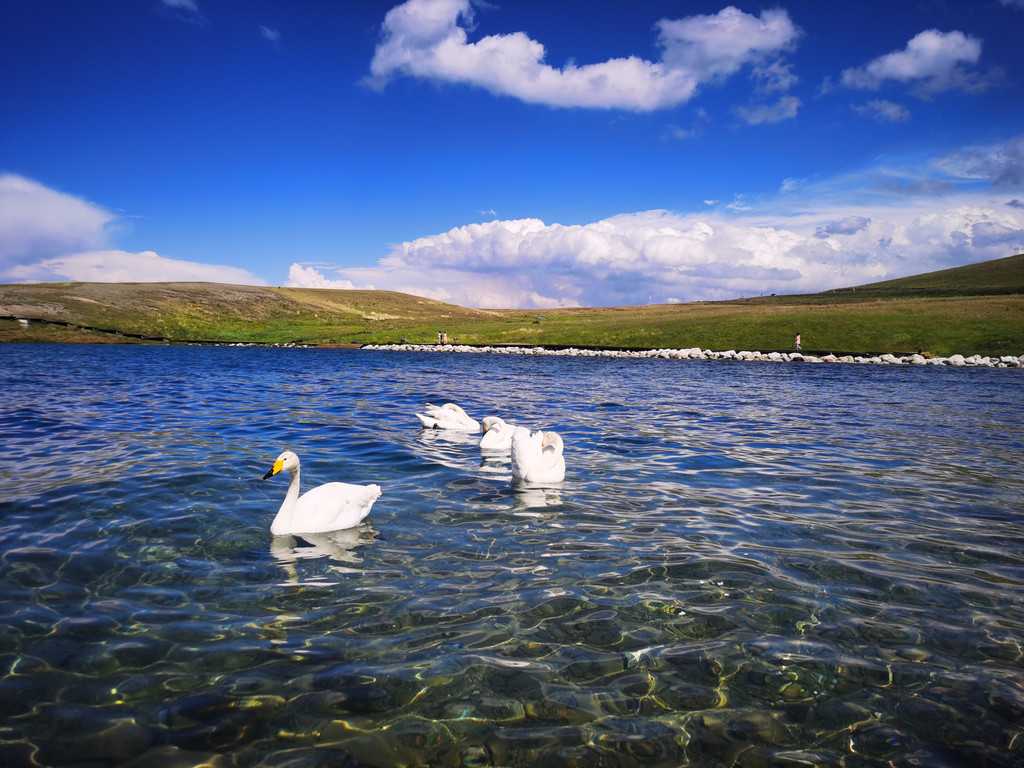 由于背靠雪山,赛里木湖湖边又是广阔的草原,清澈蔚蓝湖水像镜子一样,映照出蔚蓝的天空和如画的山峦。每年的六七月份,是湖边的草原上野花盛开的季节,这是赛里木湖游玩的黄金时节。今天刚刚到达赛里木湖时天还很不错,驻足灵虾湾与十里长堤时还晴空万里,湖远看很蓝,近看水很清澈,非常漂亮。不料这天气说变就变,从高白鲑餐厅吃完午餐出来,远处已经开始有大片乌云缓缓到来,风逐渐变大,估计是场不小的雨,当我们经过亲水滩观看湖里天鹅时,太阳已被遮盖了,湖水浪大,天鹅在浪中摇曳,但仍没有打散游客们驻足欣赏的心。