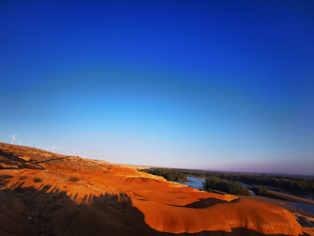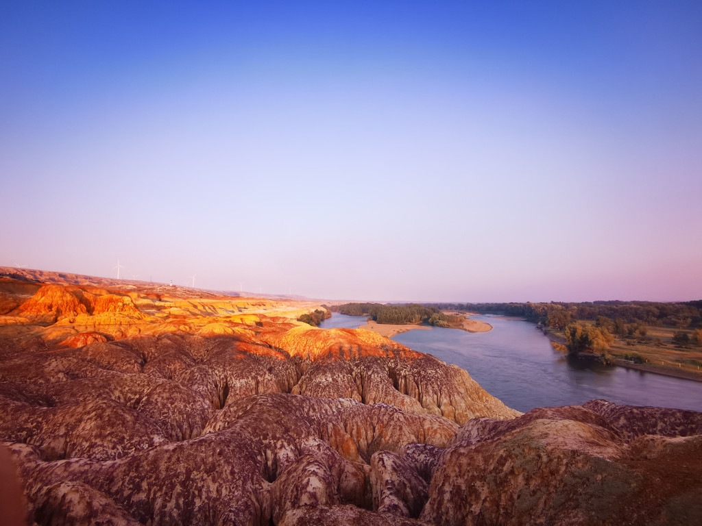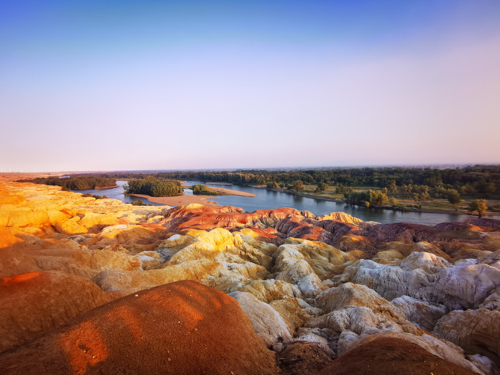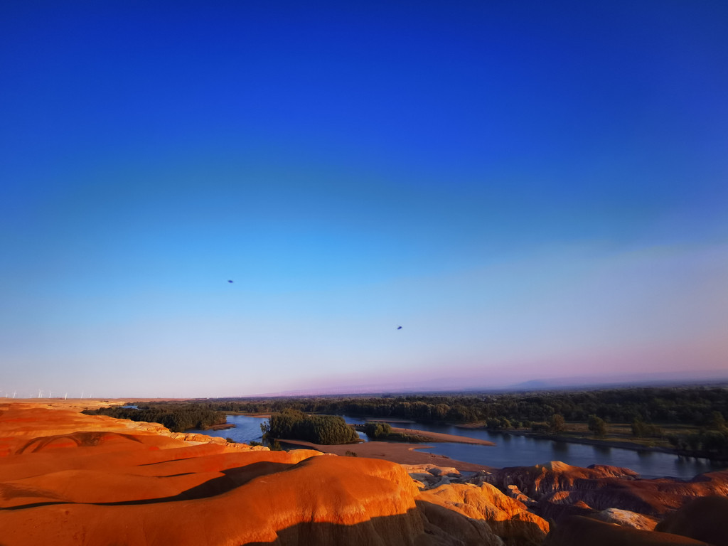 北疆的傍晚时间可与南方的傍晚时间不一样,一般北疆阿勒泰地区的日落都在22点以后,天色彻底暗下里得23点以后了,所以北疆的傍晚时间大约是20点半以后。五彩滩景区被我国唯一一条自西向东注入北冰洋的额尔齐斯河将河岸分成青翠密林和五彩丘陵两部分,一河两岸,两岸不同天;最佳的观赏时间是日落时分,白天的五彩滩非常晒,且基本没什么遮拦,且光线效果一般,故要来就算日落时分,否则来了一定会失望,由于夏天景区最后入场时间是21点,所以建议从布尔津县城大概20点左右出发,大约30分钟车程可到达五彩滩景区,可提前携程购票,现场取票,还是挺方便的。五彩滩景区检票进门后往左看是五彩缤纷的一大片河岸雅丹丘陵,往右沿着木栈道可以不同角度观看,有多个角度的观景台,一直往右走可以一路欣赏美丽的日落,景区周边有一大片风车,夕阳下尤其美,需要注意的是傍晚后五彩滩的蚊虫特别多,提前喷好驱蚊液。