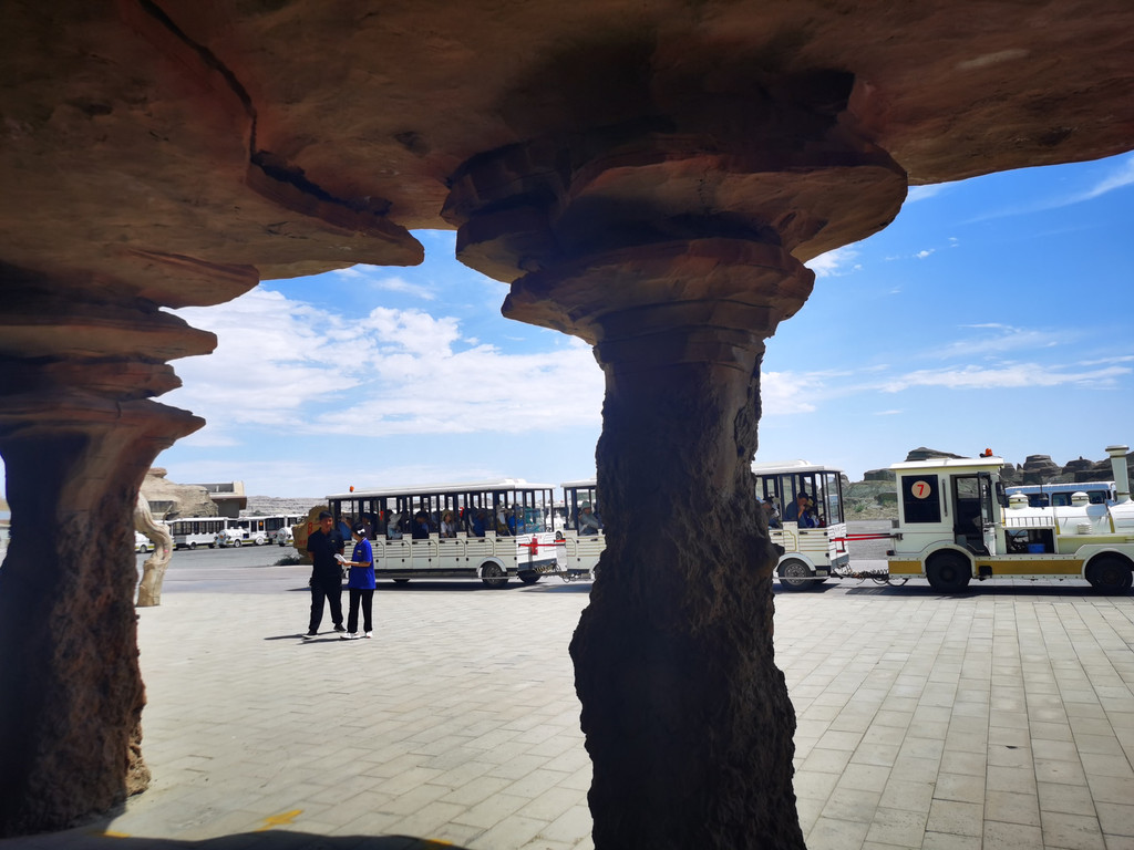 魔鬼城很大,而且多数地方没有遮拦,盛夏艳阳天,大家选择的基本都是乘坐小火车游玩,一路车上会有电子解说,经过著名景点会放慢车速,共经停五站,经过站点会停留让游客下车自行游玩,游客游玩后在上车站点等候下一部车得到来,有空位即可上,一般等车时间不长,10分钟左右。