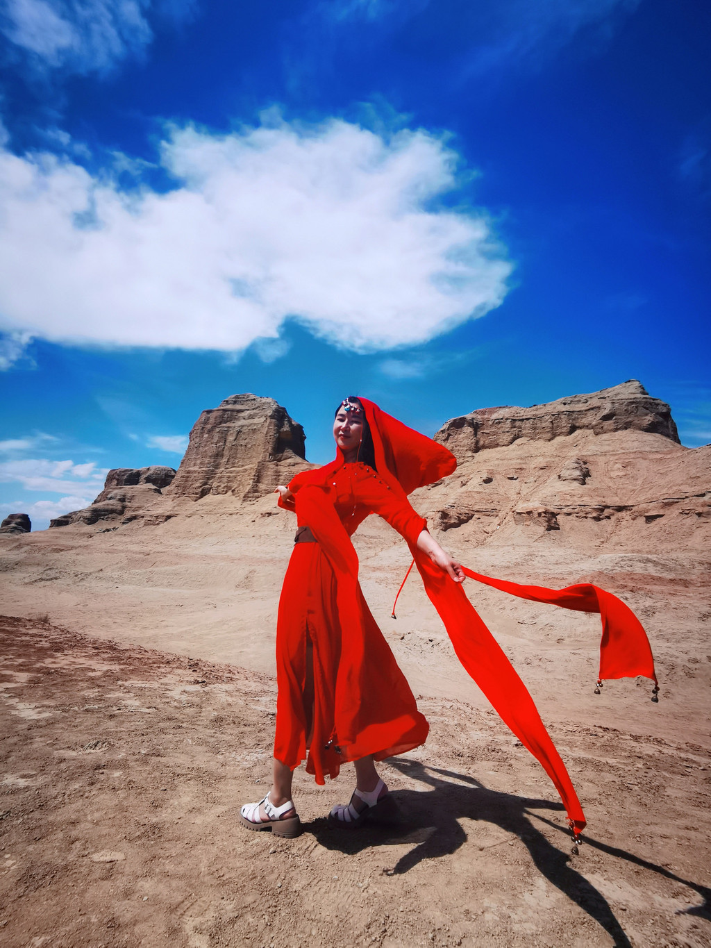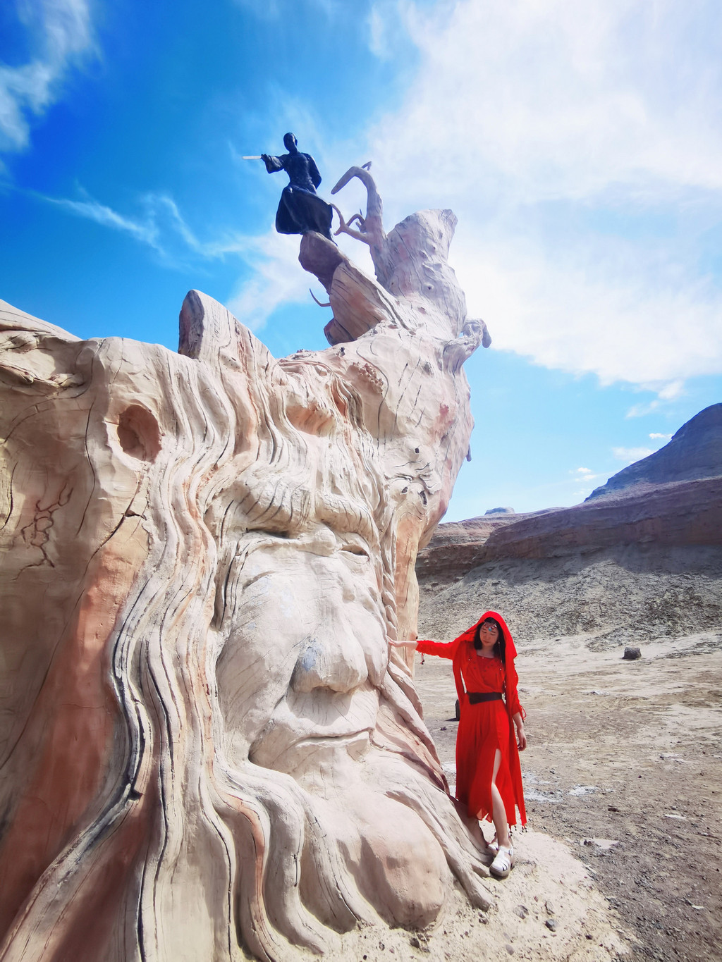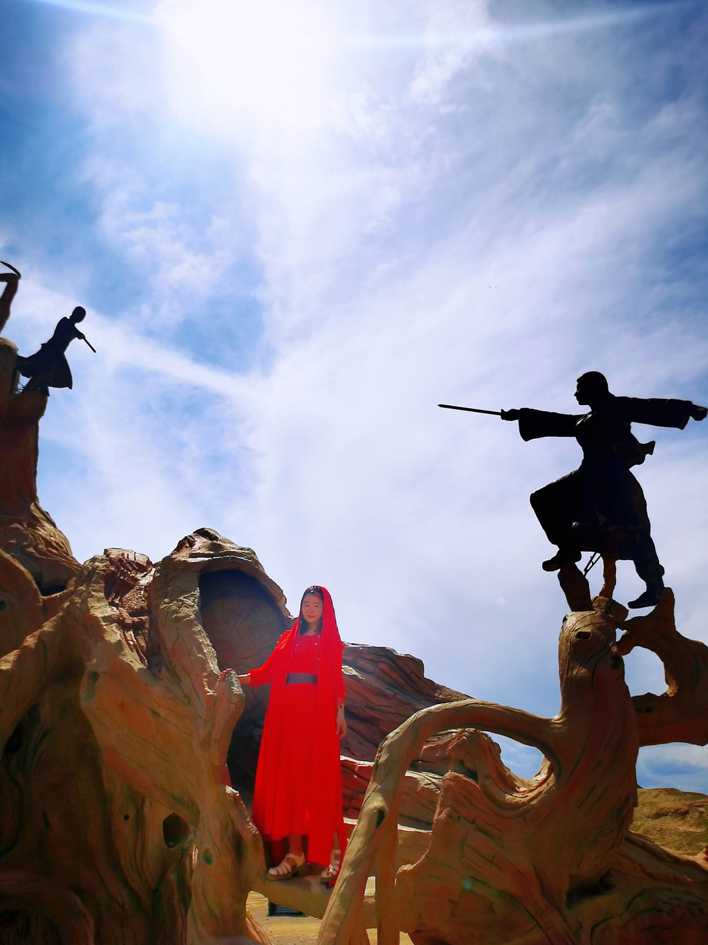 第三站,《七剑下天山》《英雄》取景地,很多人会爬上景区最高处观景台观看,我们反而选择了观景台一侧的荒芜区域,这里人少,处于风口,可以拍出长裙飘逸的美照。