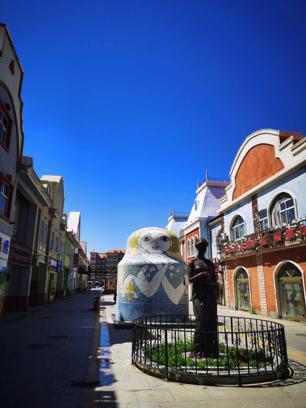 午后的布尔津县城太阳晒,不适合大街上暴晒溜达,我们换了个方式游览这个小县城,开车溜达一圈县城,沿途观看各色俄罗斯风情的建筑,既不热还省力,也是别有一番乐趣;溜达一圈县城,到达俄罗斯风情街及老码头风情街,其实都在一处方位,白天街上人很少,很多店铺都没开放,据便利店老板说晚上这里的老码头夜市将会比较热闹。回民宿休息,待傍晚再去距离县城约24公里处的五彩滩欣赏美丽的雅丹地貌及日落。