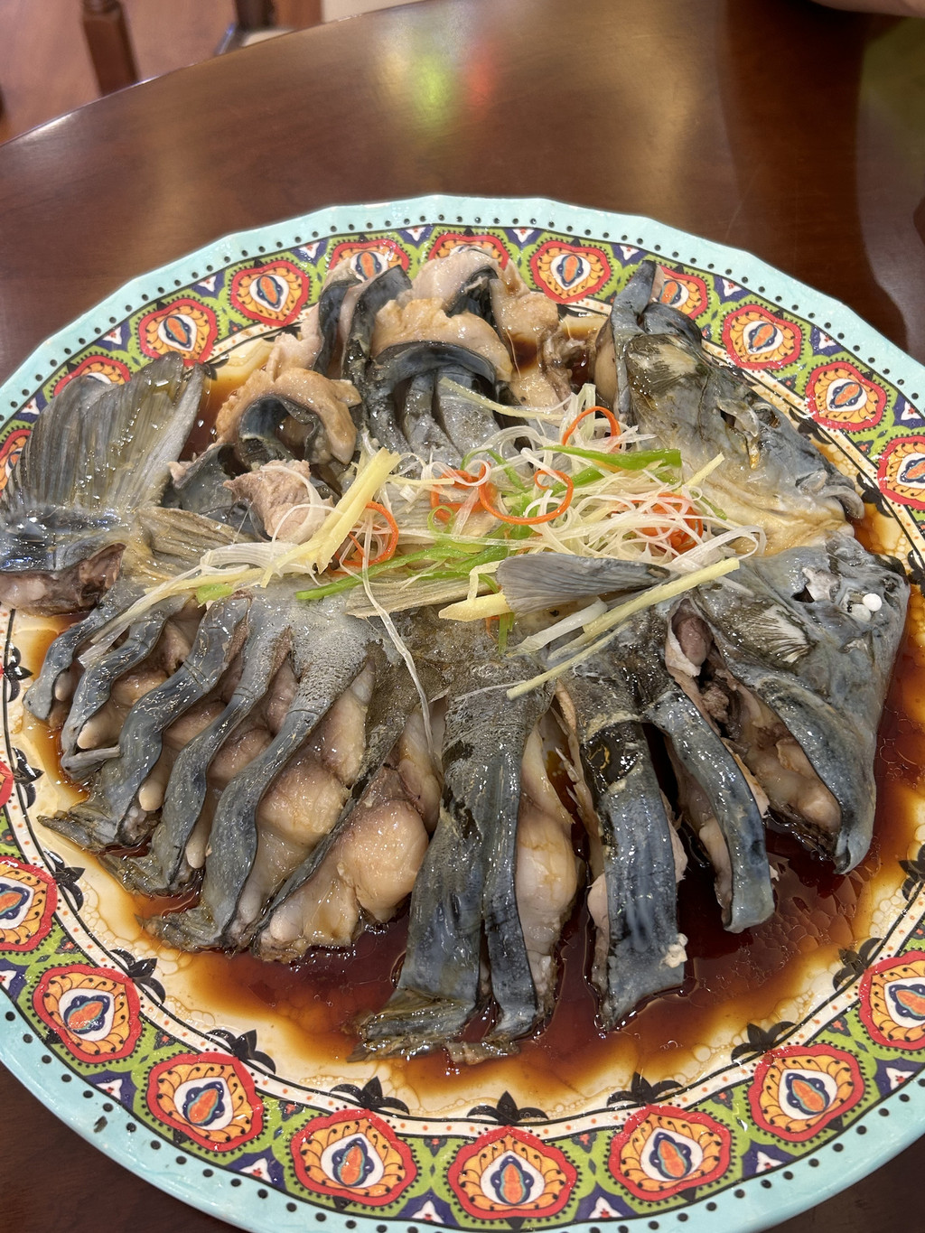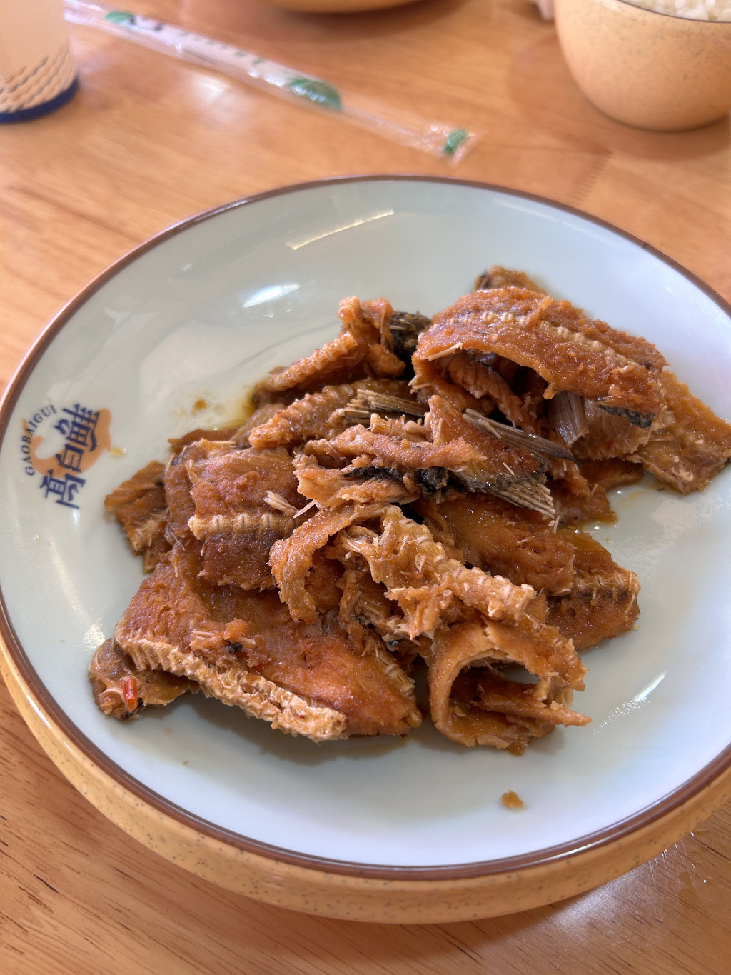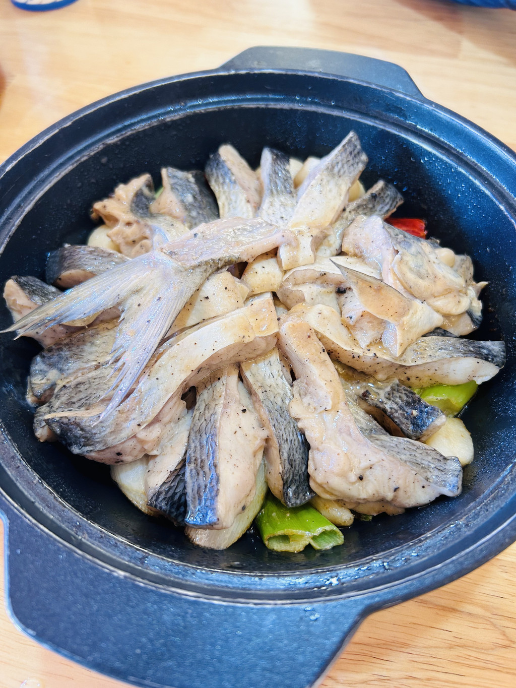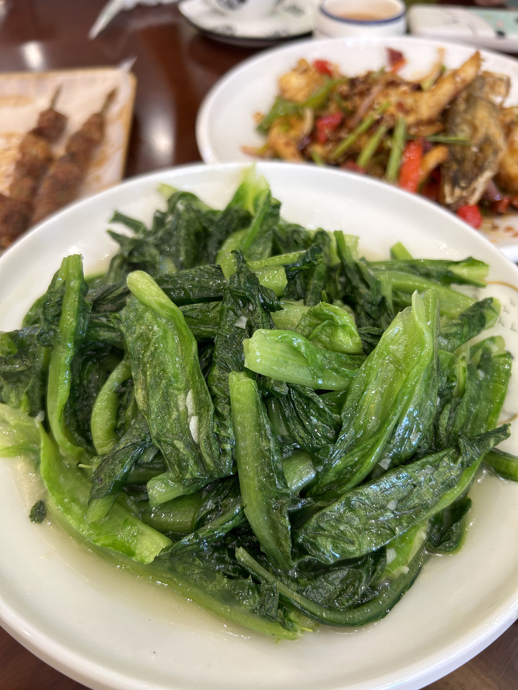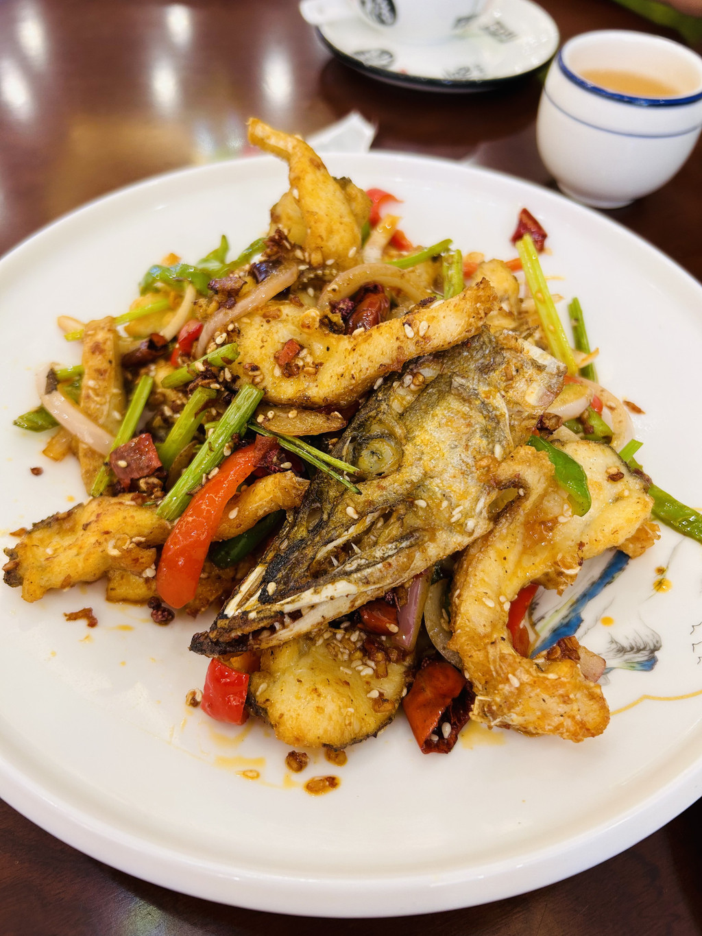 到达布尔津县城时已是中午,入住位于老码头风情街不远别墅区的布尔津勿忘我精品民宿,蓝色风格的民宿很是显眼,祺哥和祺妈很快就发现了,我这个司机还在到处瞎找着,办理好入住,外出觅食。平台上找了家评价不错的餐厅-兰沁园丝路美食,布尔津县城白天人很少,正常都是下午或晚上到达布尔津县城休息中转,向我们这样慢悠悠中午就到的很少,所以进餐厅,发现就我们一桌,算不算独家烹饪了,哈哈。来布尔津,那一定得尝尝这里特色的冷水鱼了,这冷水鱼高于20度的水温就无法生存了,所以咱们南方的孩子一定得好好尝尝;布尔津冷水鱼以狗鱼最负盛名,肉质鲜美,几乎家家都有狗鱼这道菜,爆炒、烧烤方式最多。兰沁园平台里有个套餐,含爆炒冷水狗鱼、清蒸冷水稀麟鲑、沙葱炒鸡蛋、蒜蓉油麦菜及米饭,分量足,味道棒,价格适中,我们仨是吃撑了。