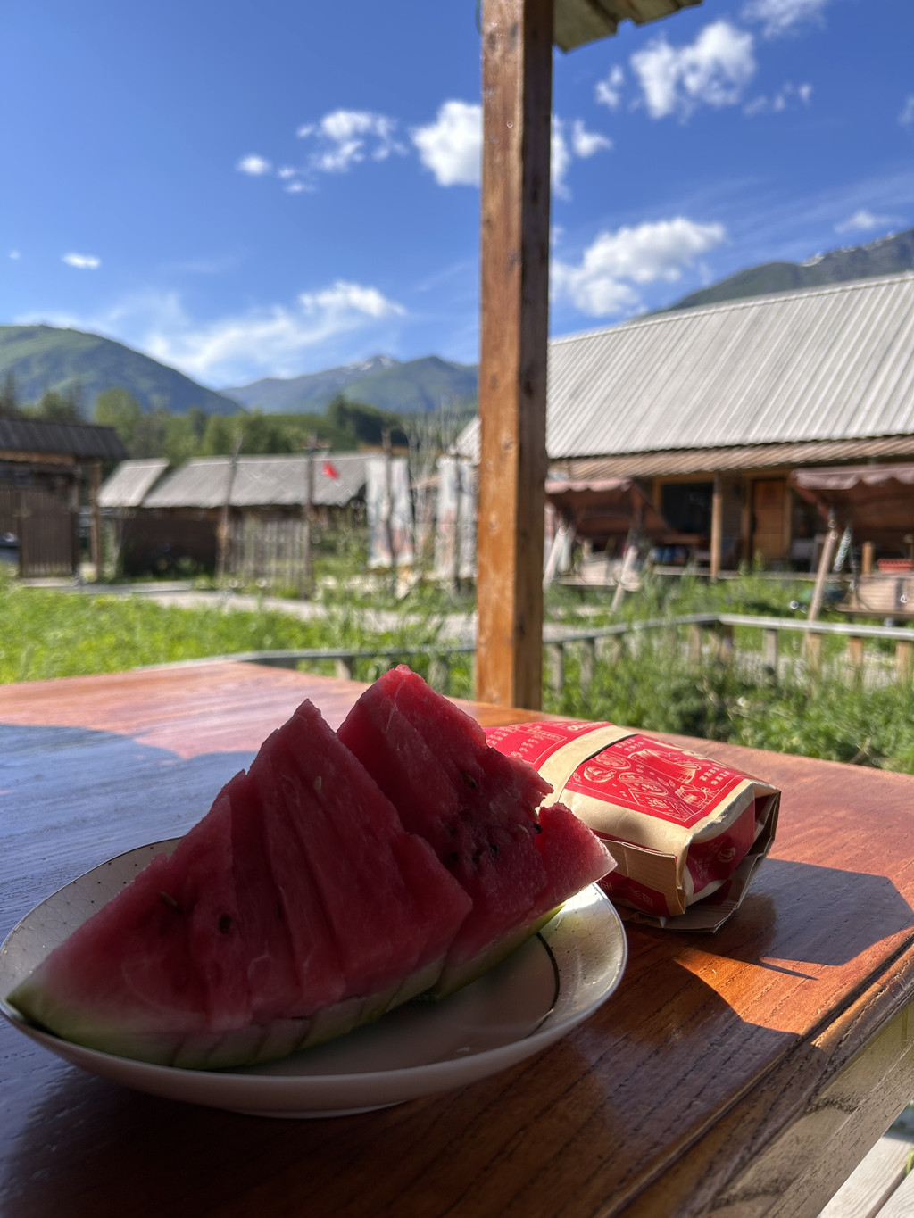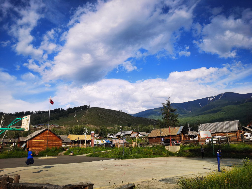 我们住在老村村委会附近民宿,旁边有个村部室外篮球场,刚好民宿老板这有篮球,喜欢篮球的祺哥可激动了,向老板借了篮球拉上我陪他打篮球去了,期间还有当地年轻人主动加入我们打球,这应该是他新疆之行最开心的经历之一了吧,打到不想吃饭了,哈哈。白哈巴村吃饭价格相对高点,但也能接受,晚餐在民宿搞定,羊肉串味道很不错,炒羊羔肉也很赞,打完球能吃到一顿美食,真是满足的一天,唯一遗憾的是晚上乌云较多,没法看到美丽的星空。