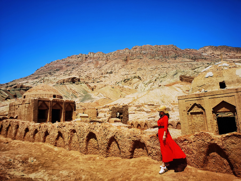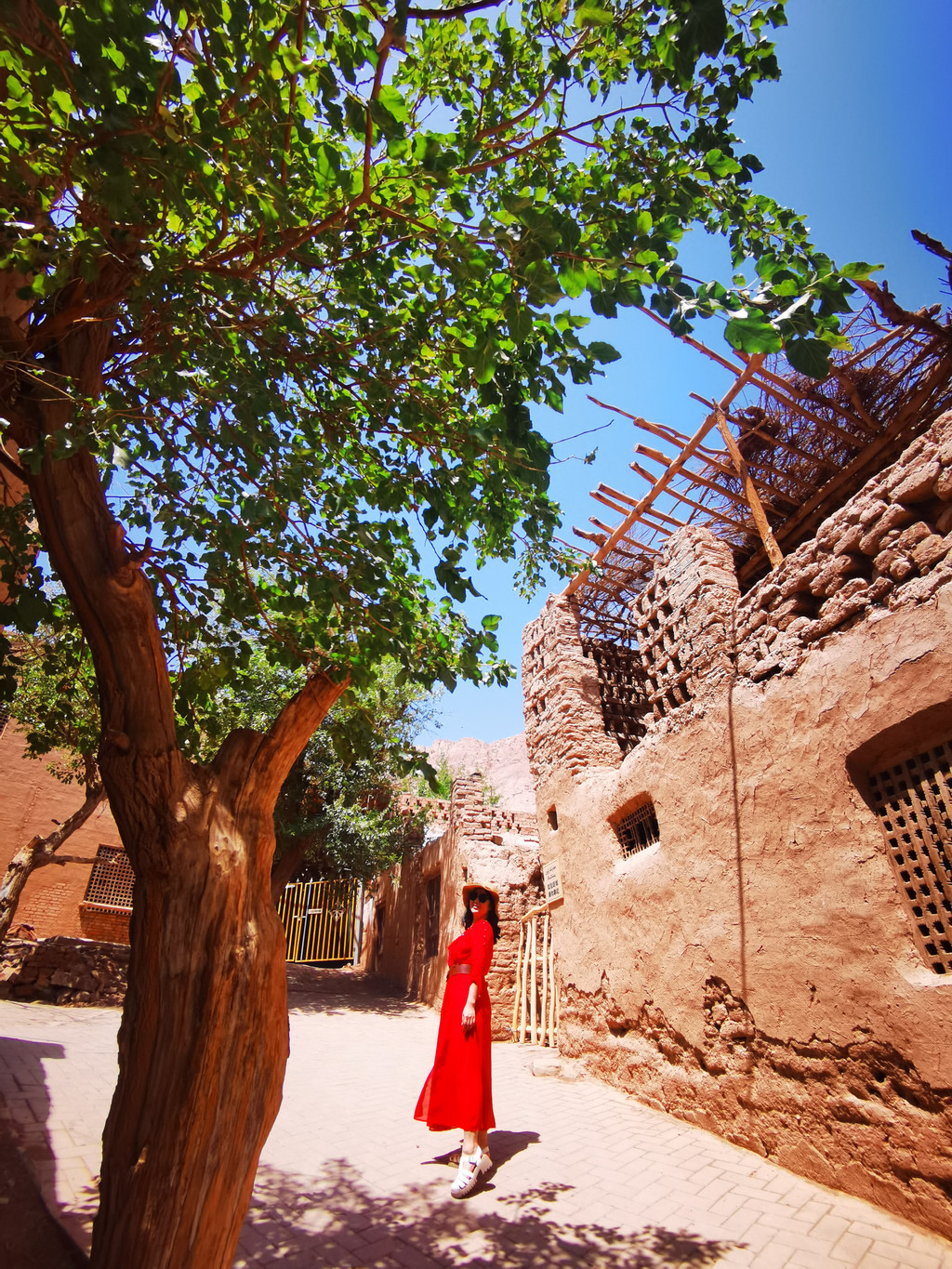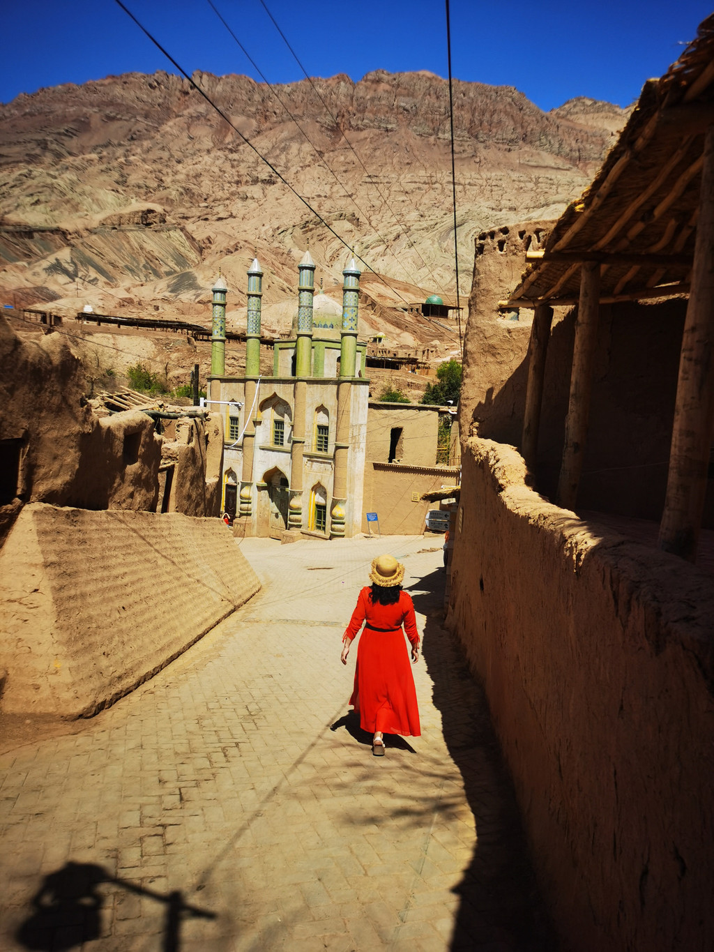 今日上午乘着火州还未发威,前往千年古村-土峪沟麻扎村,大约30多分钟车程会先到达火焰山景区,看了很多攻略,景区内真没啥好看的,便在景区门口打个卡留个念,继续行驶30来分钟到达土峪沟麻扎村。麻扎村位于新疆吐峪沟大峡谷南沟谷,村子掩映在白杨和桑树之中,一条不宽的河从北向南穿村而过,沿河两边,建着零散的维吾尔族民居,完整地保留了古老的维吾尔族传统和民俗风情,据考古史料记载,麻扎村距今已有2000多年的历史了。在麻扎村内保存有大量维吾尔民族的传统民居,全是黄黏土生土建筑,均是土木结构,有的是窑洞,有的是二层楼房结构,底层为窑洞,上层为平房,屋顶留方形天窗;有的窑洞是依山依坡掏挖而成,有的窑洞是用黄黏土土块建成。其特点是经济实惠、冬暖夏凉、造型美观。家家户户由弯曲和深浅不一的小巷相连,即使从屋顶走也可达到串门的目的。现在的麻扎村村内很多民居多已成危房,多数村民已搬迁到沟口附近的新村了,遗留的民居多为景区进行修缮加固,还都保留的原来的模样,在周边一片的荒芜中,屹立着这么一座千年古村,生命是这么坚强和灿烂。麻扎村不大,走走看看拍拍1个多小时能搞定,村里最佳的拍摄景观就是那座不知道多少年历史的古老清真寺了,如果要拍麻扎村全景,最佳的机位就在村口即景区入口处的停车场。
