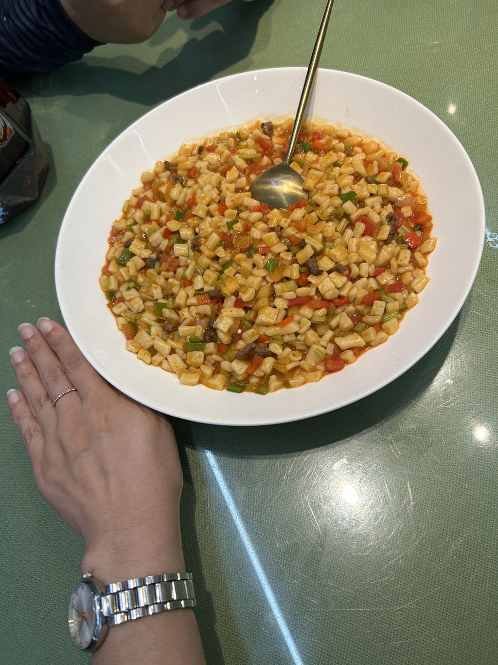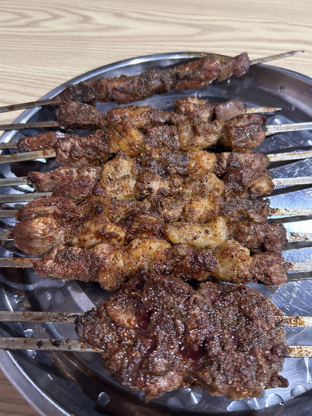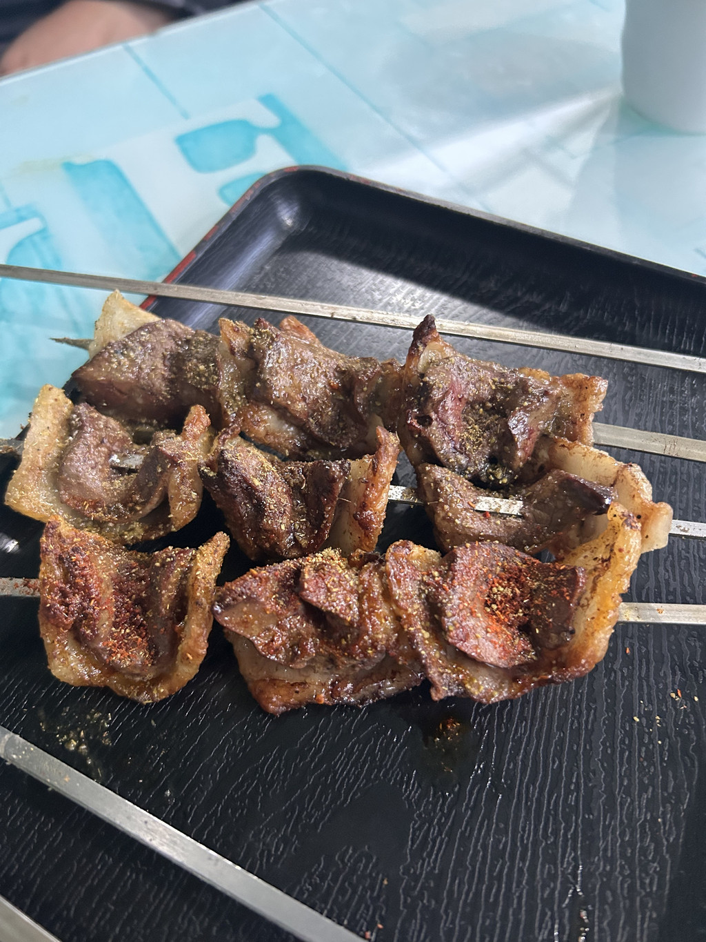 晚餐随意在民宿附近找了家餐厅-八号美食庭院,餐厅门面简单不起眼,此时店里还没有客人,一开始我们觉得是一家普通的餐厅,但在特克斯特色美食羊排揪片子上来后,喝上一口清甜的汤,吃上一口毫无膻味的鲜嫩羊排,着实惊艳,一大盆羊排揪片子我们吃了个精光,这应该是此次新疆行吃的最好吃的一道菜了;还有这家店铺的烧烤也很赞,尤其是油包肝,特别香,羊肝入口即化,一点都不腻;这家店很低调,来的客人不多,但是老板真的很用心,羊排用的是草原原生小羊羔肉,非常好吃,来特克斯一定要吃这家,强推。